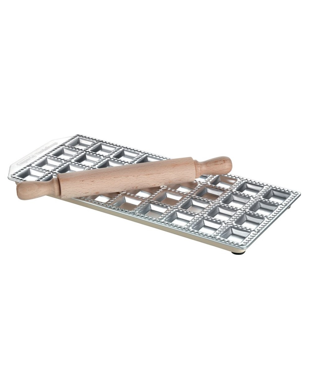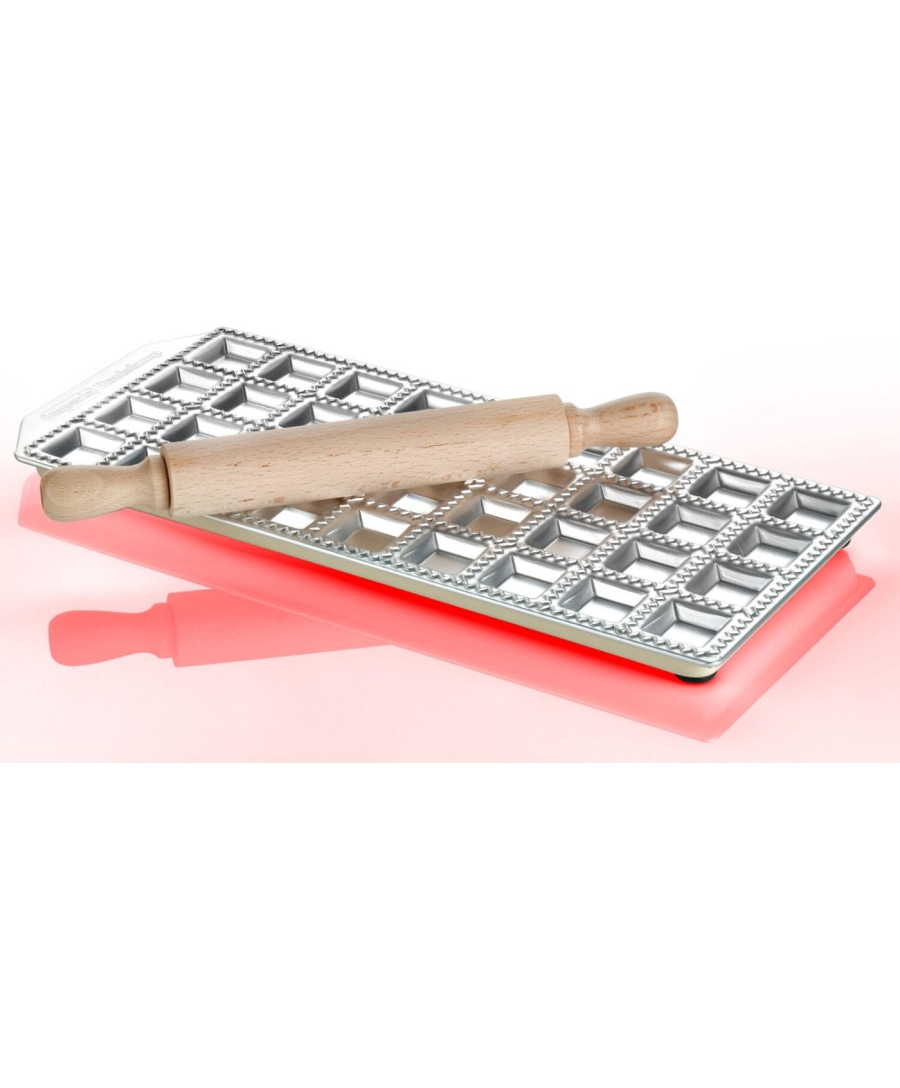 Stampo 36 ravioli quadrati con matterello in legno