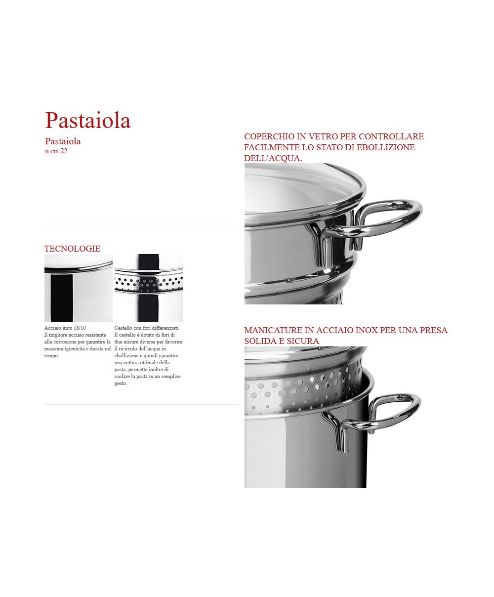 La nuova pastaiola Lagostina in acciaio permette di scolare la pasta in un semplice gesto.Il suo cestello con fori differenziati aiuta anche a raggiungere una migliore cottura della pasta.