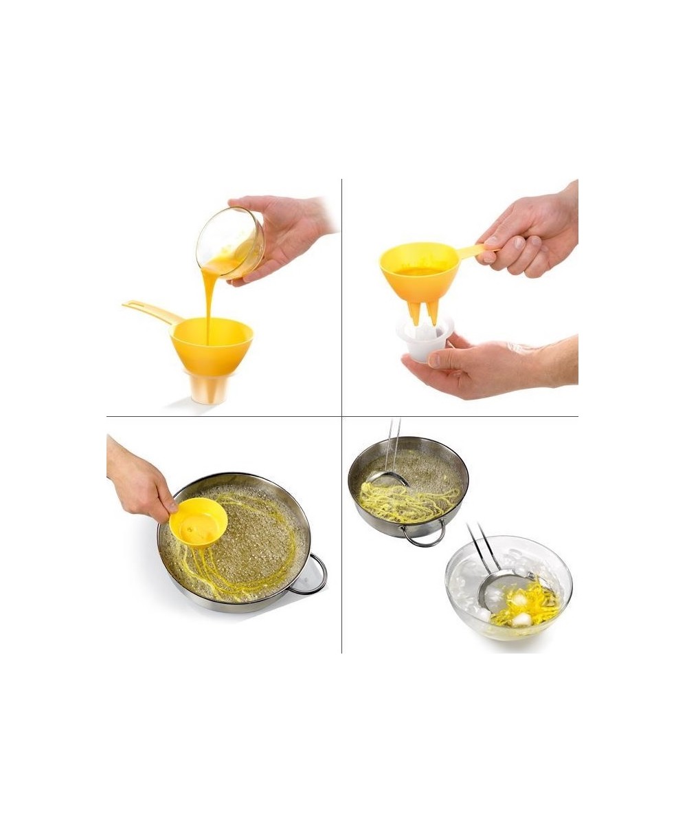 I fili d'uovo sono una decorazione leggera e scenografica per piatti dolci o salati perfetti per guarnire o farcire arrotolati canapé torte e dessert. Con questo utensile prepararli è semplicissimo e nella confezione oltre alle istruzioni trovi anche la ricetta.