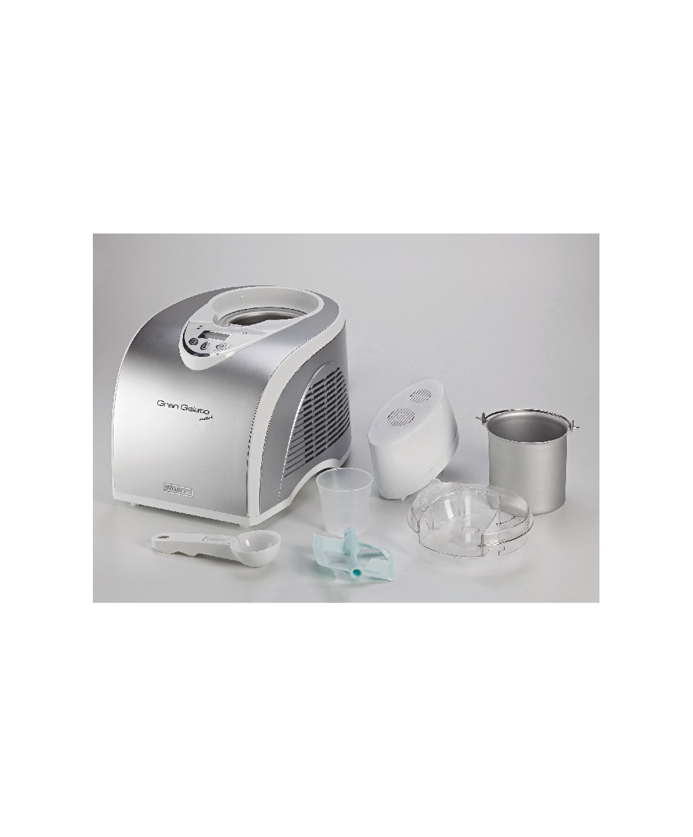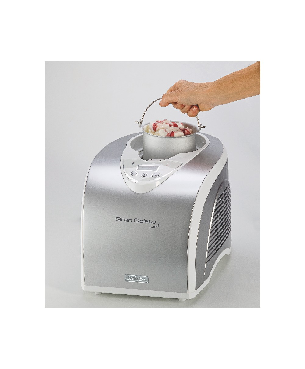 "Gran Gelato Metal è la gelatiera autorefrigerante di Ariete per preparare il gelato fatto in casa buono e genuino in tutta semplicità. Quando la macchina del gelato viene attivata infatti, si avviano contemporaneamente il processo di miscelazione degli ingredienti e di refrigerazione, grazie al compressore interno, che raffredda il composto e realizza un gelato cremoso e gustoso. Non avrai bisogno di raffreddare il contenitore dentro il freezer, ci pensa la gelatiera a mescolare e refrigerare tutti gli ingredienti inseriti. Il cestello estraibile, inoltre, ti consentirà di trasferire il gelato appena preparato all’esterno della gelatiera e procedere subito con un nuovo gusto! Sul display LCD si potrà facilmente decidere il tempo del processo di creazione del gelato, così da raggiungere la consistenza e la cremosità desiderata. Al termine del processo, la macchina del gelato si arresta automaticamente e attiverà la funzione prolungata di raffreddamento, che manterrà al freddo il gelato appena preparato fino ad 1 ora.