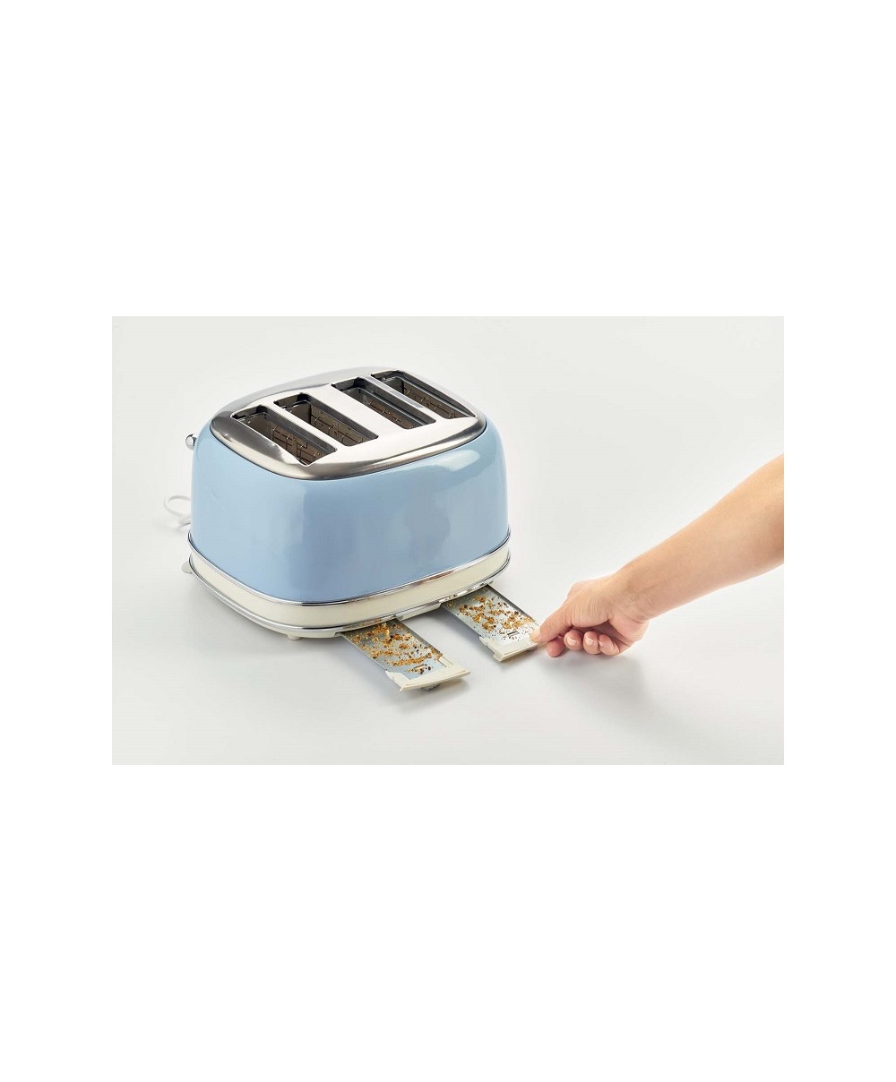 "Tostapane vintage a 4 fette, senza pinze, per tostare fette semplici o panini imbottiti, con controllo separato delle fette 2x2, espulsione automatica e vassoio raccoglibriciole rimovibile, funzione di autocentraggio, 6 livelli di doratura, pareti cool touch (pareti fredde) e funzione di scongelamento, riscaldamento e cottura.