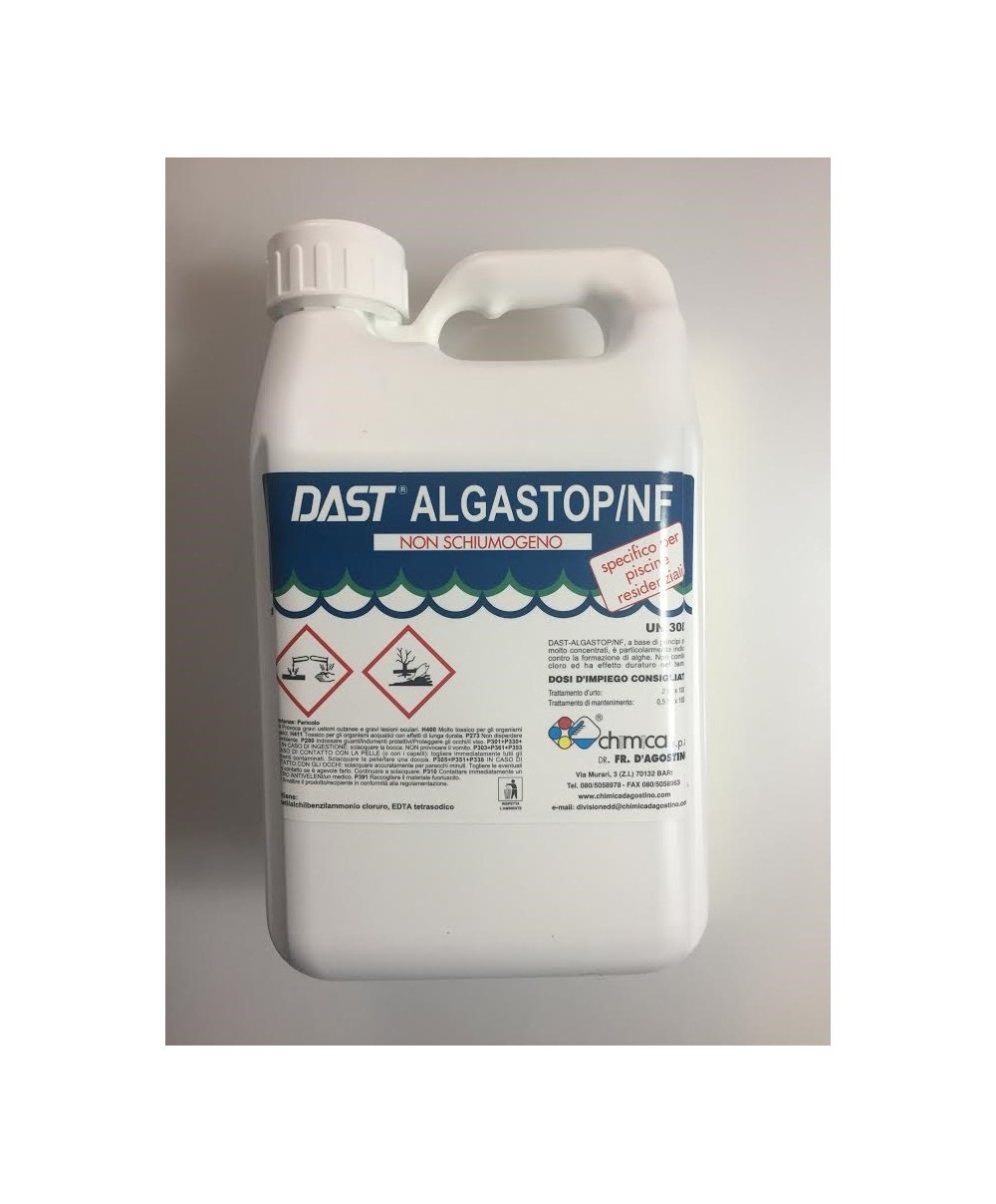 "L'Algastop di Dast (Cod. DPALF0) è un antialghe Liquido concentrato e non schiumogeno. È consigliato particolarmente contro la formazione dele alghe.