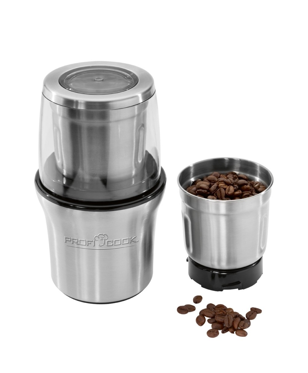 Il macinacaffè elettrico ProfiCook PC‑KSW 1021 2‑in‑1 macina fino a 85 g di caffè fresco e trita spezie, erbe e noci con un solo apparecchio. Compatto, resistente e dotato di coperchio trasparente, garantisce prestazioni veloci e precise ogni giorno in cucina.