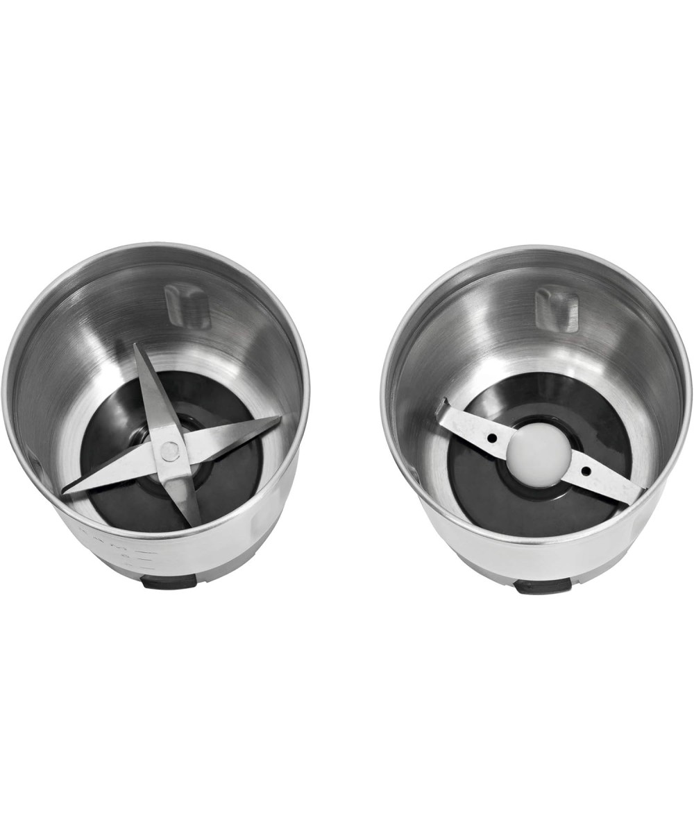 - 2 contenitori di cui uno con lama "a due parti" ideale per chicchi di caffè e l'altro con lama "quatro parti" per condimenti, noci o spezie