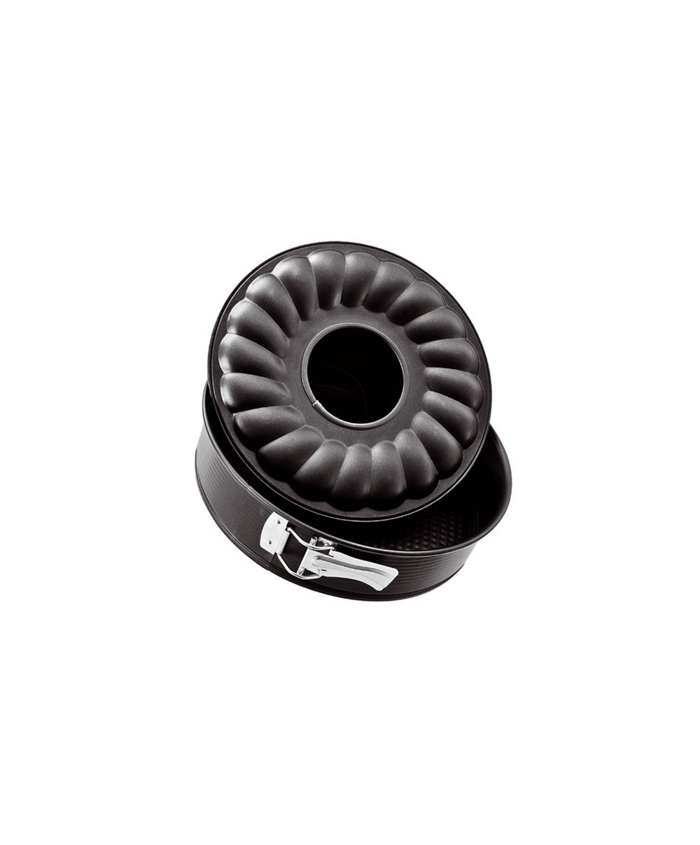 La tortiera apribile con 2 fondi intercambiabili di Eva permette di sformare le torte senza rotture e danni grazie alla cerniera laterale. 047415 è la tortiera classica che diventa una per ciambellone con un semplice movimemto.