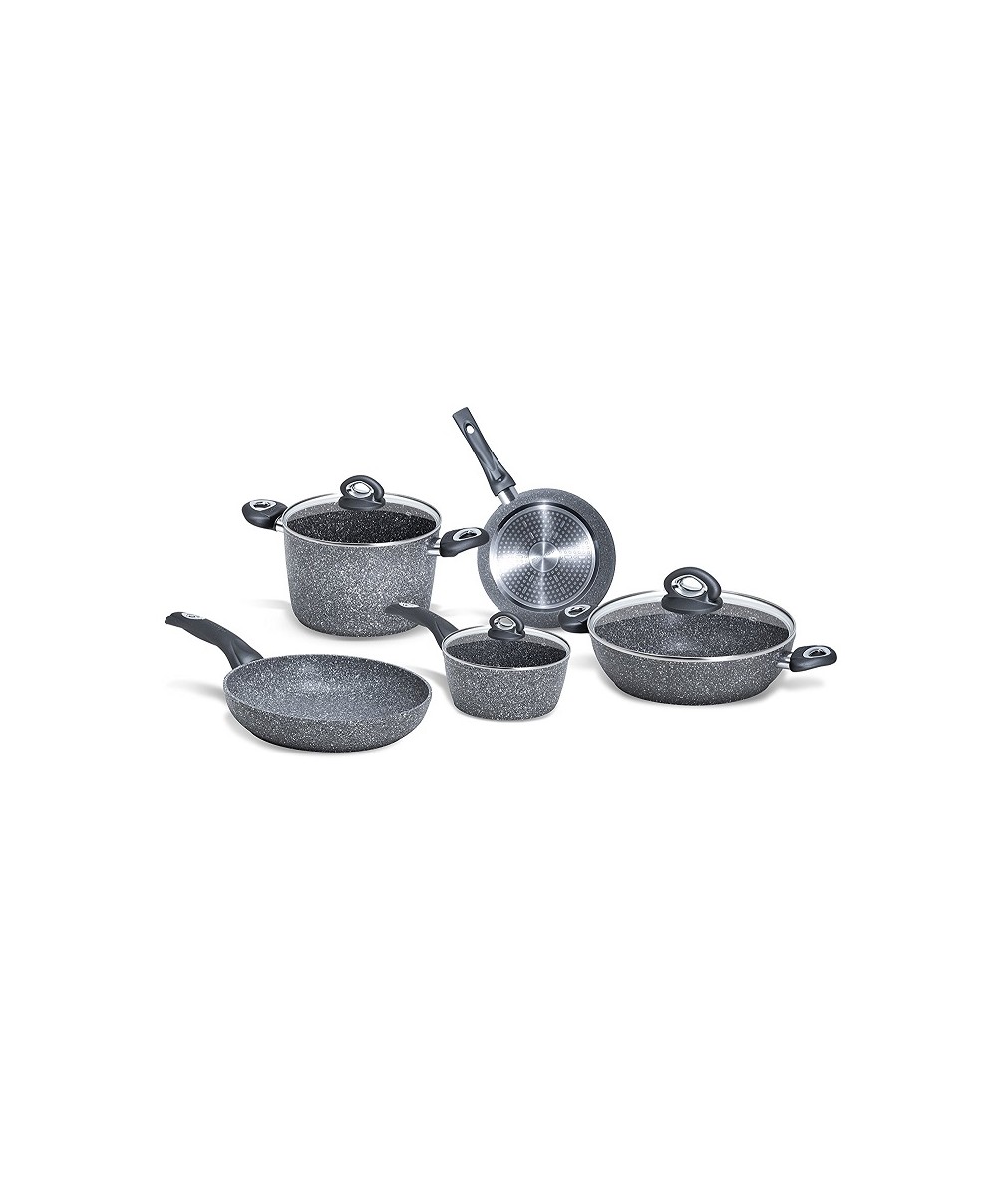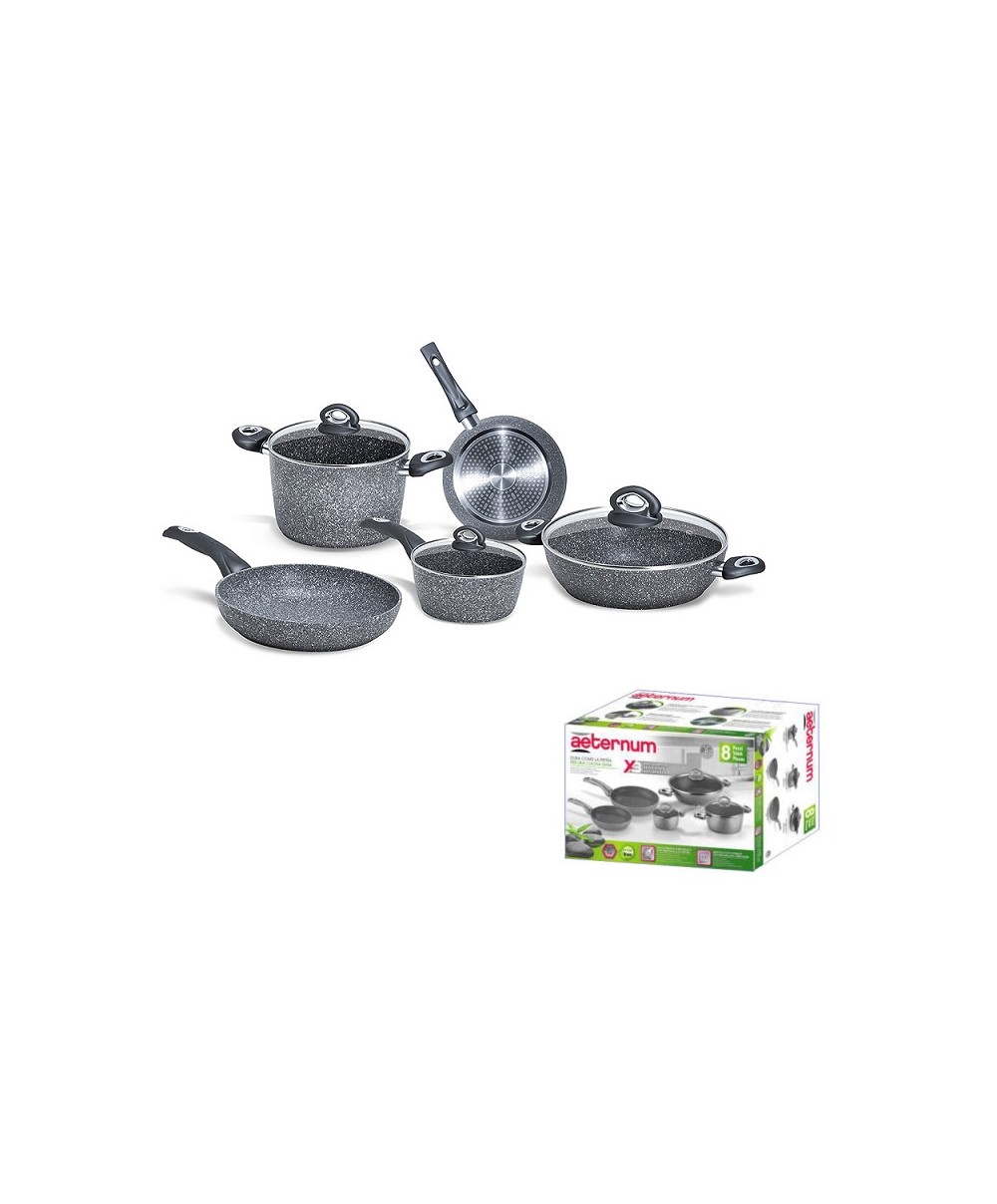 La batteria da 8 pezzi Madame Petravera Plus di Aeternum è composta da casseruole e tegami in alluminio con il rivestimento interno ed esterno rinforzato con particelle di pietra.