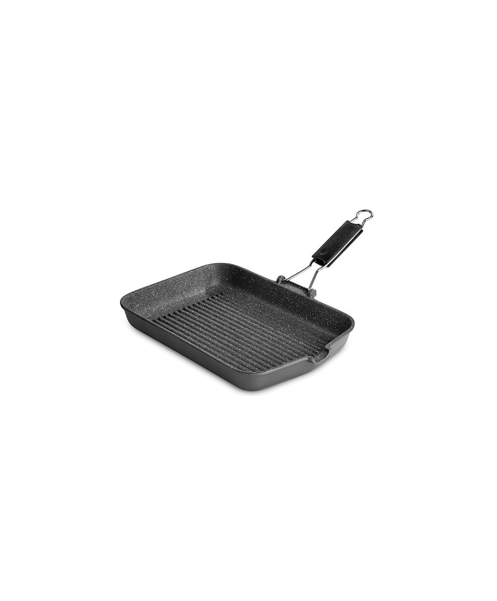 La griglia è realizzata in alluminio pressofuso e perciò si riscalda velocemente ed in modo uniforme consentendo un ottima cottura alla griglia. É dotata di rivestimento antiaderente effetto marmo resistente ai graffi ed alle abrasioni. Grazie al manico pieghevole la griglia può essere riposta facilmente.