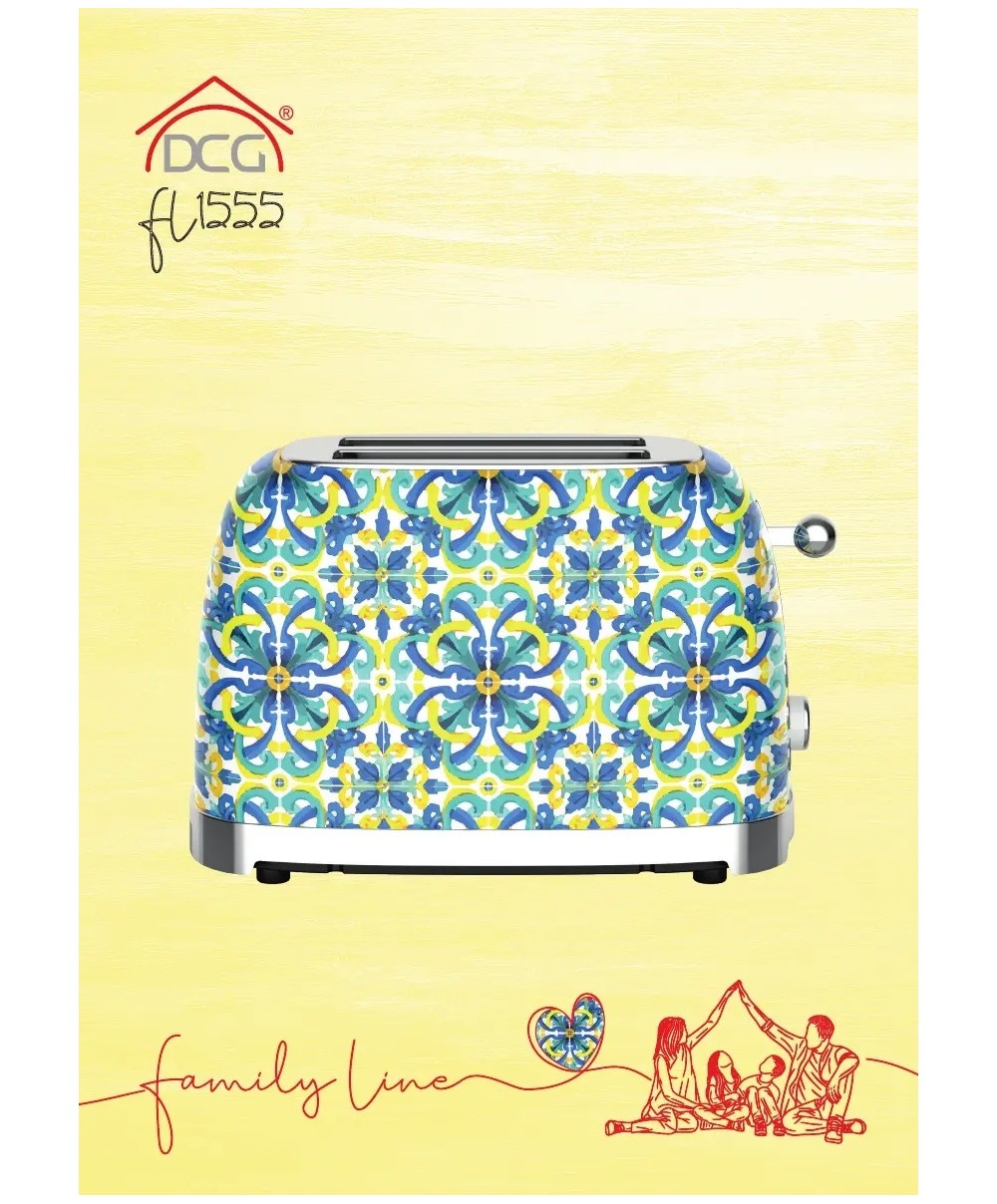 FL1555 è il tostapane a 2 scompartimenti ideato da DCG che si contraddistingue per il suo stile retrò e le sue maioliche. Dimensioni compatte per adattarsi a qualunque ambiente.