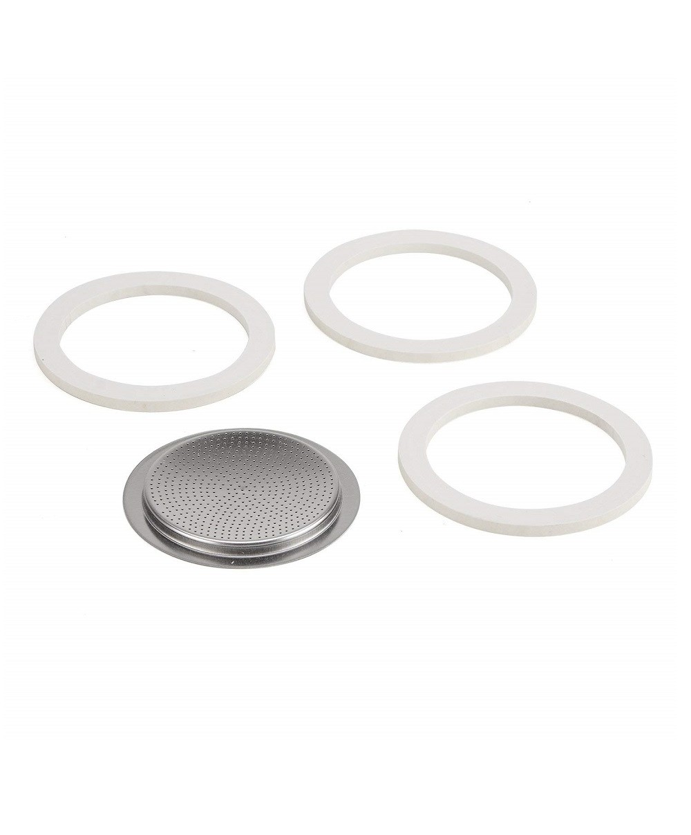 Kit originale Bialetti composto da 3 guarnizioni e da una piastrina filtro. Ideali per le caffettiere Bialetti in acciaio fino a 2 tazze: Venus - Kitty - Musa