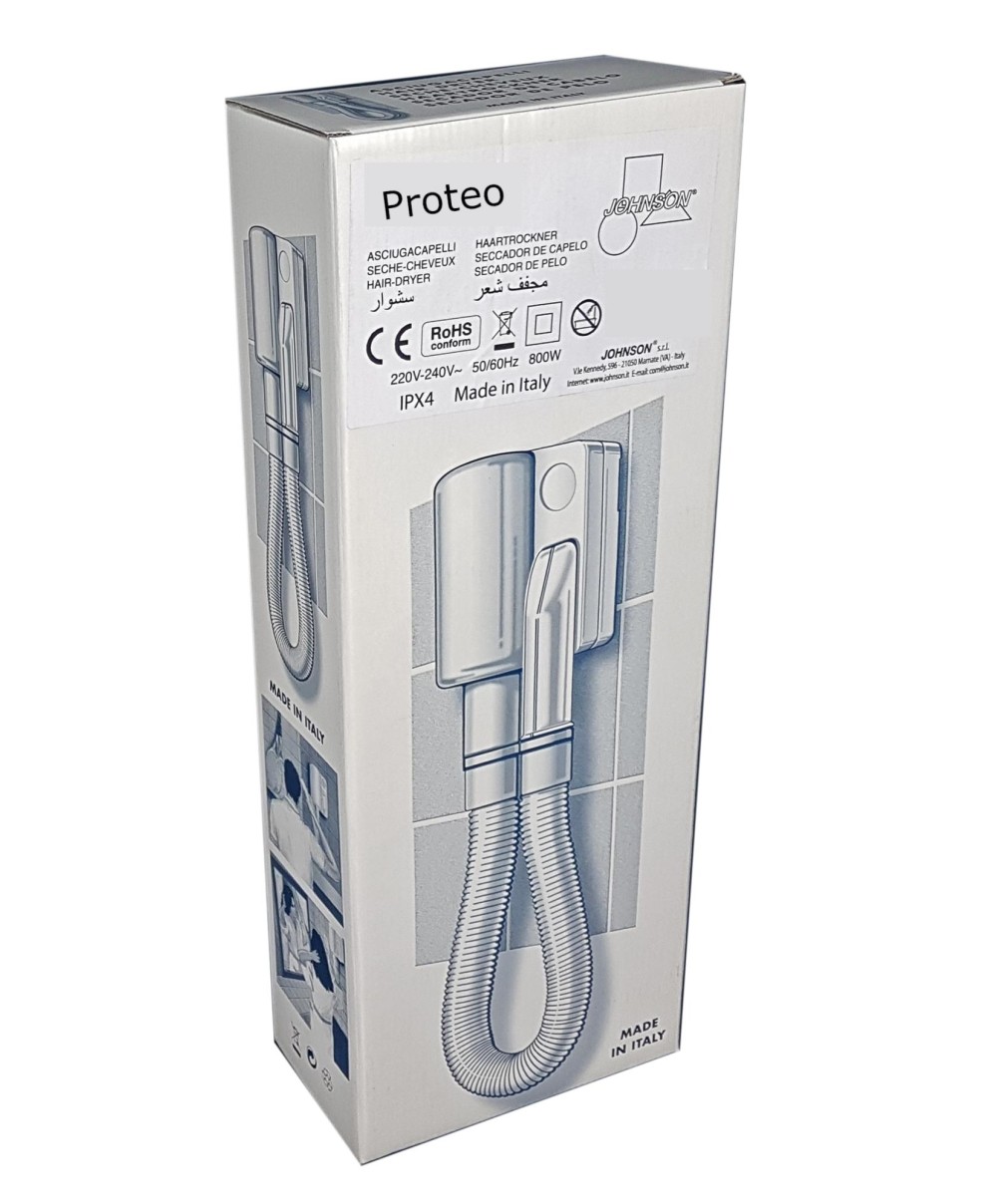 Proteo è l’asciugacapelli di Johnson studiato per le camere degli alberghi ma è anche ideale per usi più intensivi come palestre e piscine.