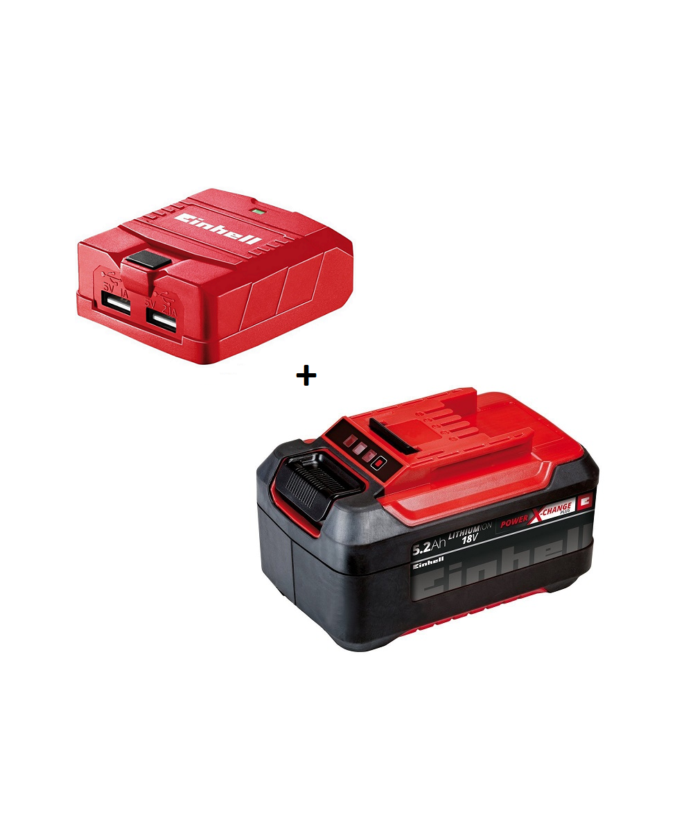 Il kit formato dalla batteria 4511437 da 5,2 Ah + l'adattatore USB 4514120 è molto utile. La batteria è la più potente tra quelle della famiglia Power X-Change di Einhell e l'adattatore Consente di utilizzare tutte le batterie di Einhell anche come batteria esterna per ricaricare tutti i dispositivi dotati di attacco USB.