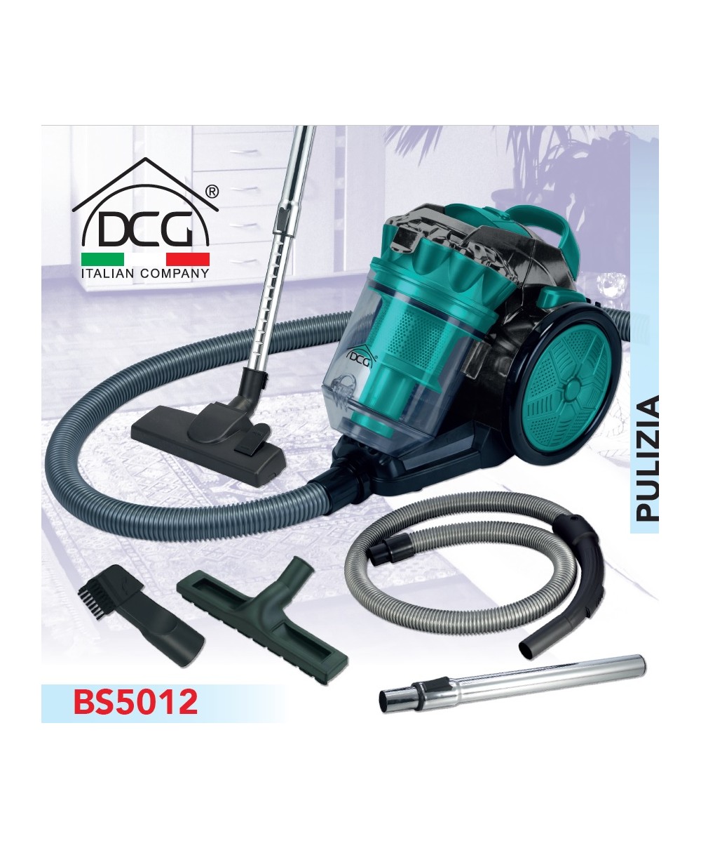 BS5012 è l'aspirapolvere ciclonica di Dcg. È dotata di filtro Hepa, numerosi accessori, interrutore a pedale e di un comodo pulsante per l'avvolgimento automatico del cavo di alimentazione.