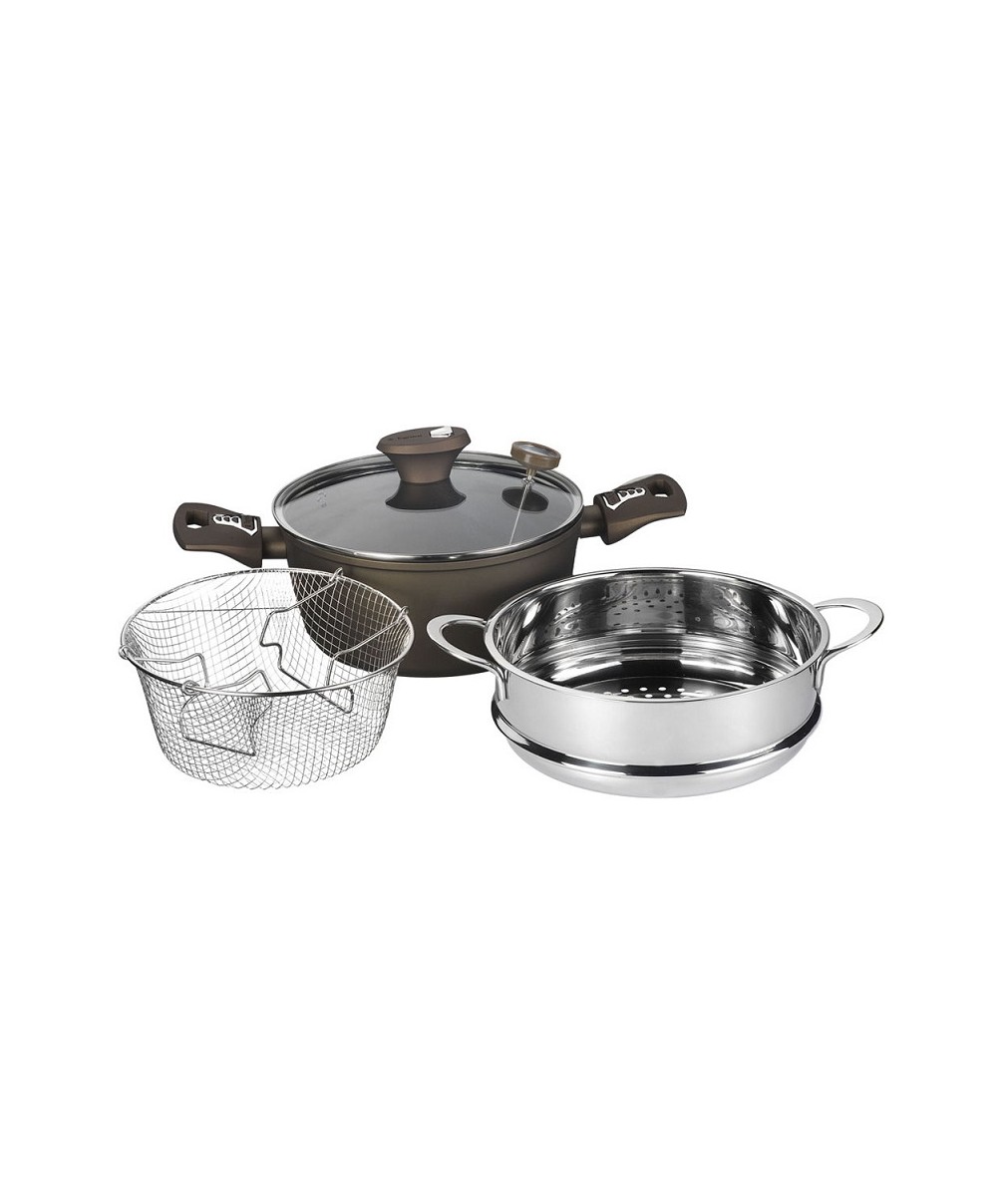"Friggivapor multifunzione della linea Diamantea di Tognana è il pratico set di Tognana ideale per cuocere a vapore e per friggere. Il set WQ7914LZODI è composto da una casseruola da 22 cm, un cestello per frittura, un cestello per cottura a vapore, un coperchio ed un termometro.