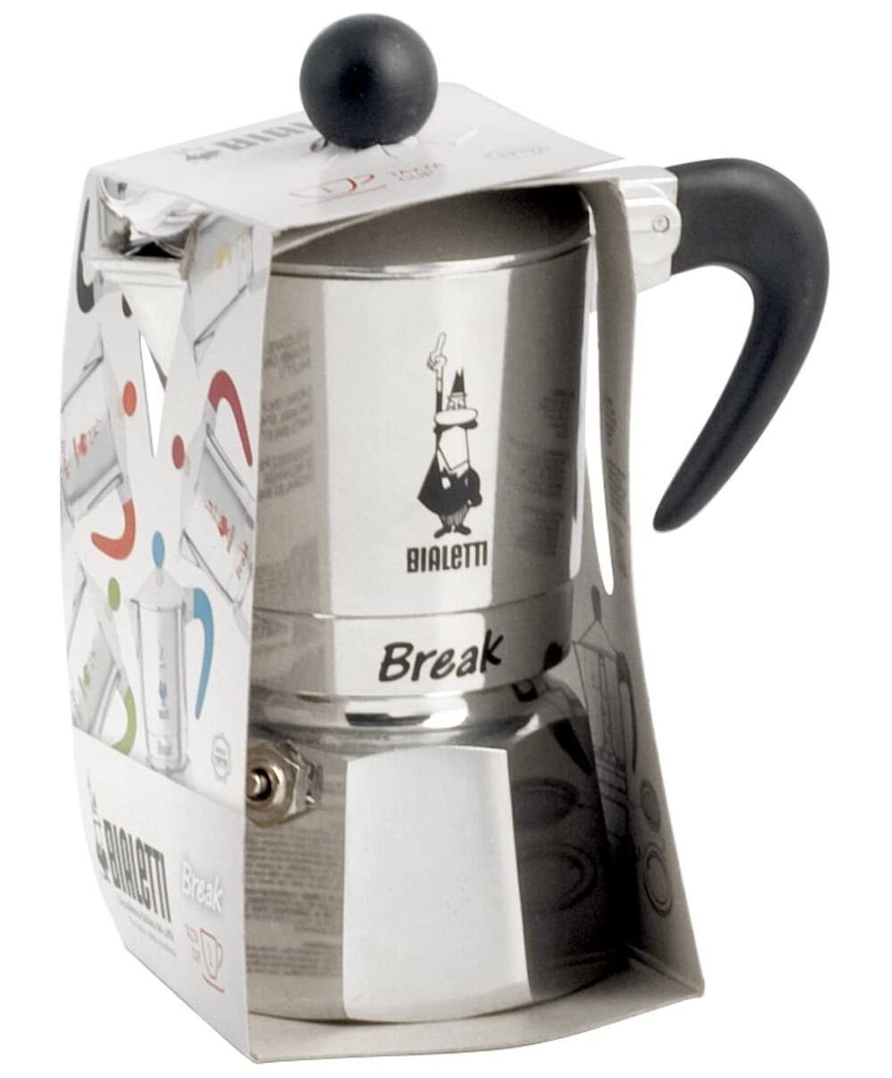 La Bialetti Break da 3 tazze è la moka in alluminio con rivestimento esterno in alluminio verniciato e manigliame in nylon.