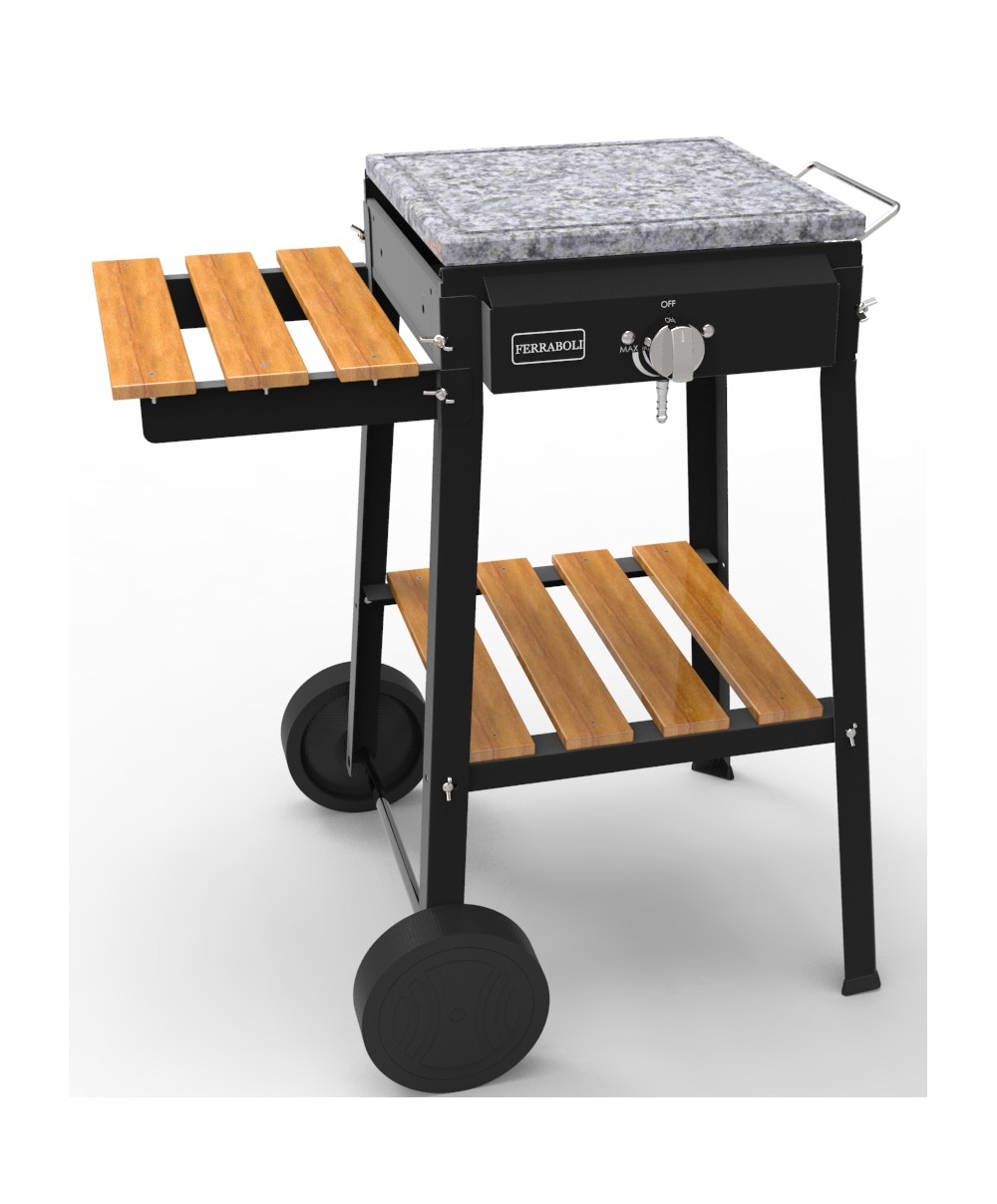 Cucinare senza grassi e unti? Con la nuovissima pietra lavica di Ferraboli si può! La pietra vulcanica ha una scanalatura su tutto il perimetro ed un foro in basso a sinistra, per poter raccogliere i grassi nell’apposito pentolino posto all’interno del braciere. La pietra è montata su una struttura in acciaio verniciato e scaldata da un bruciatore in acciaio inox. Bio Cooking a 1 fuoco ha anche un porta-pentola cromato per alimenti, da poter utilizzare alternativamente alla pietra. Il Bbq ha inoltre due comodi ripiani con listelli in legno certificato FSC, per appoggiare qualsiasi tipo di oggetto. Le ruote facilitano lo spostamento anche durate la cottura.