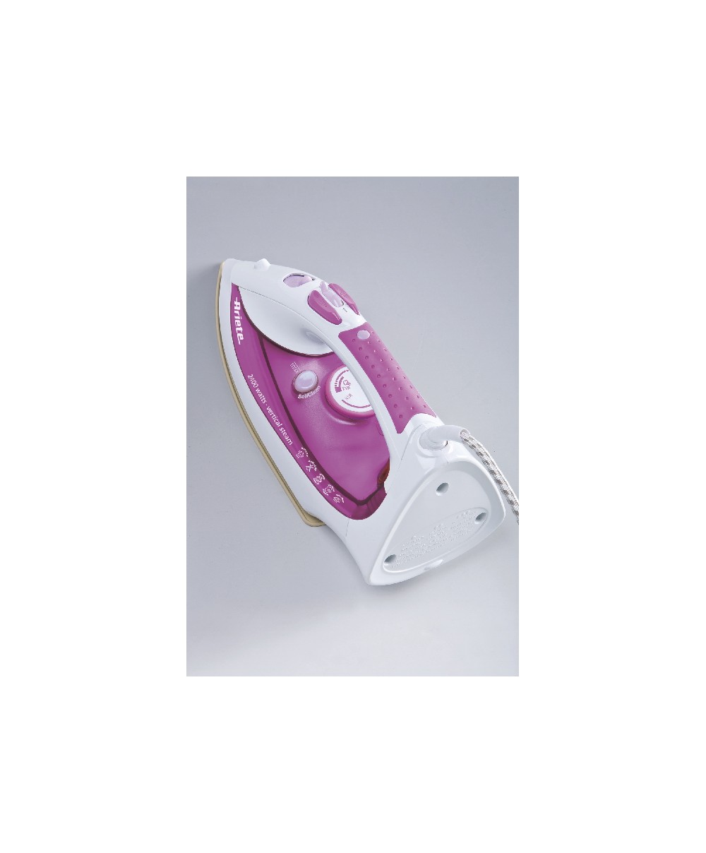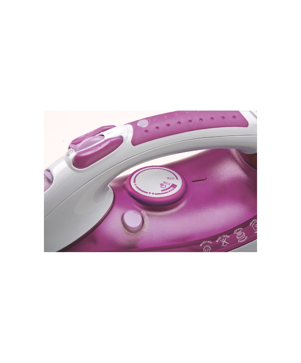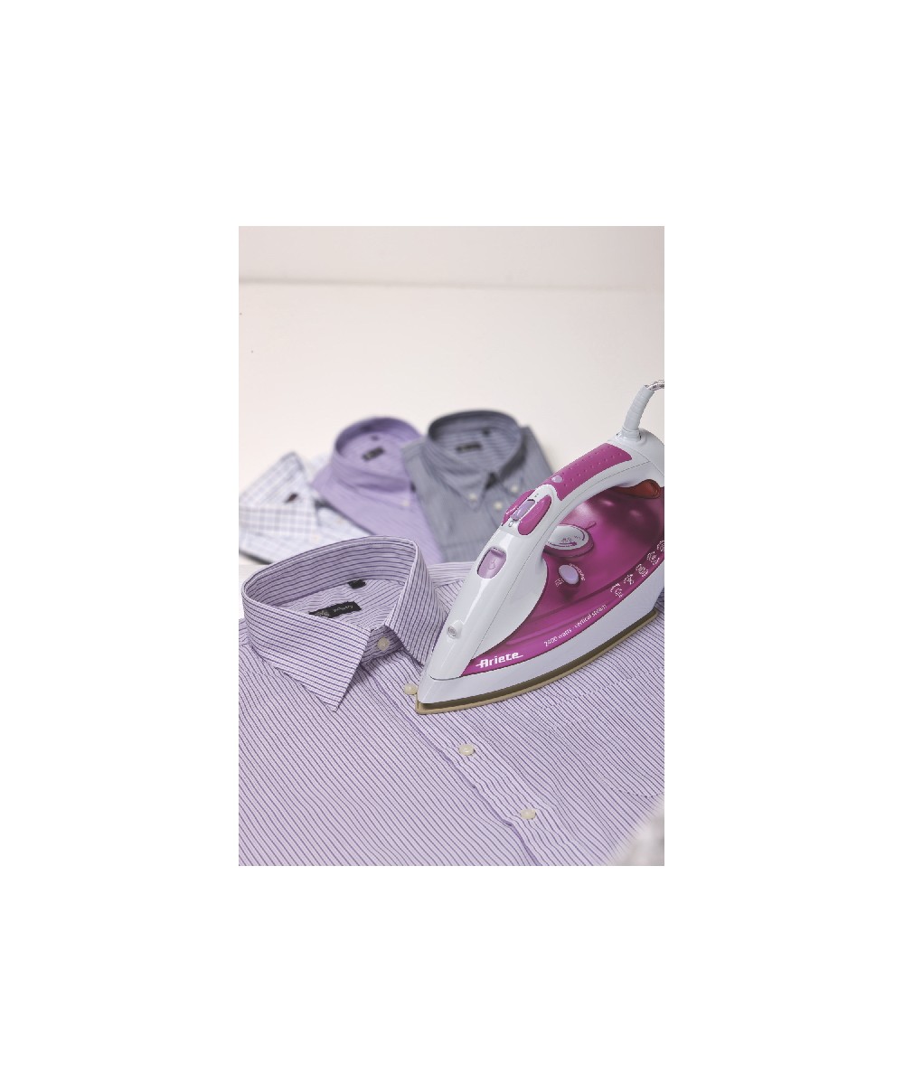 2400 watt, piastra in ceramica, ampio serbatoio 300 ml, sistema Anticalc, sistema Anti-gocciolamento, piastra in ceramica, funzione spray per inumidire i tessuti, comodo manico antiscivolo.