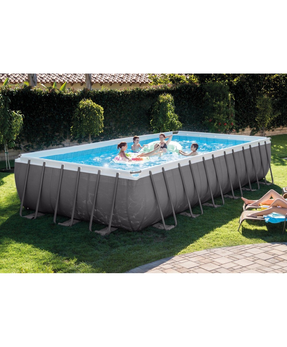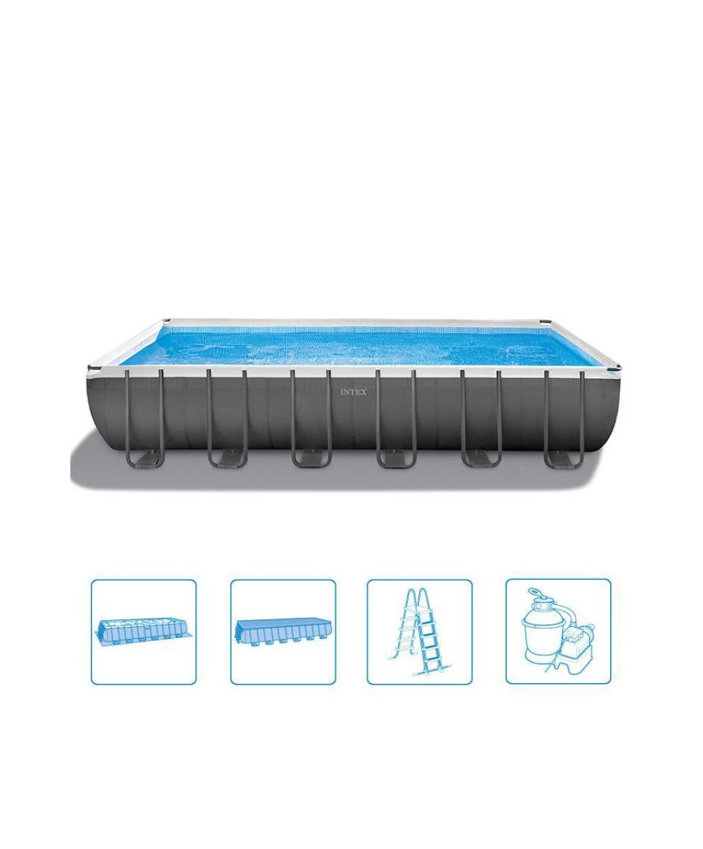 26366 è la piscina Ultra Frame rettangolare di Intex da cm 732 x 366 x 132 con pompa a sabbia clorinatore combo da 6.000 l/h e accessori.