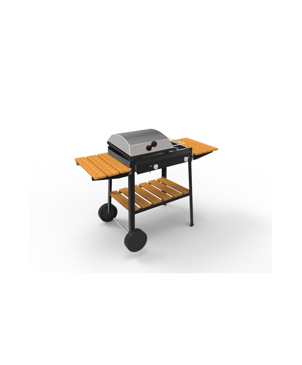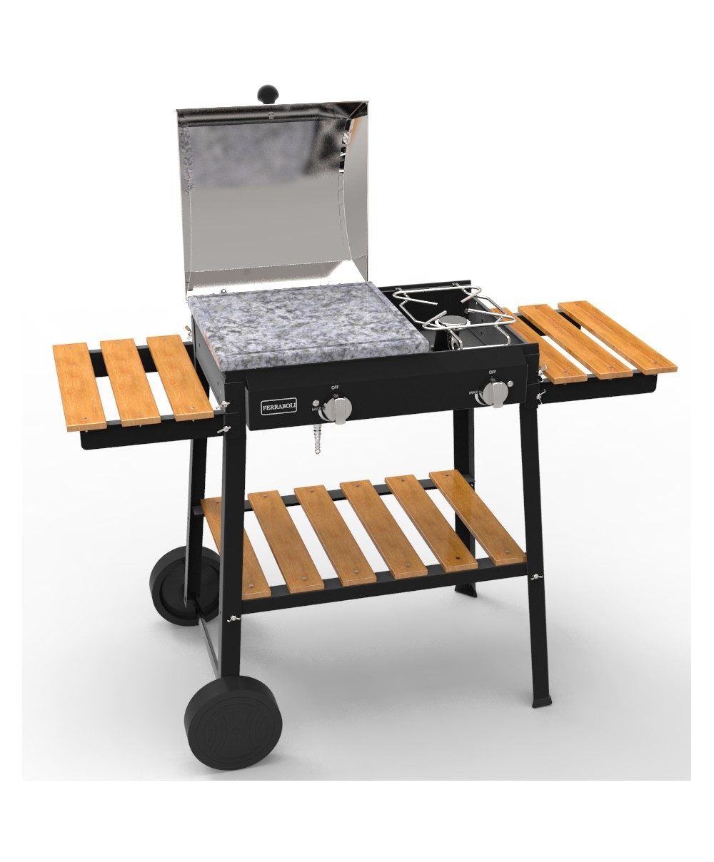 Bio cooking a 2 fuochi di Ferraboli vi offre la possibilità di cucinare senza grassi e unti grazie alla pietra lavica scaldata dal bruciatore in acciaio inox ed alimentato a gas. È dotato di coperchio e ruote.