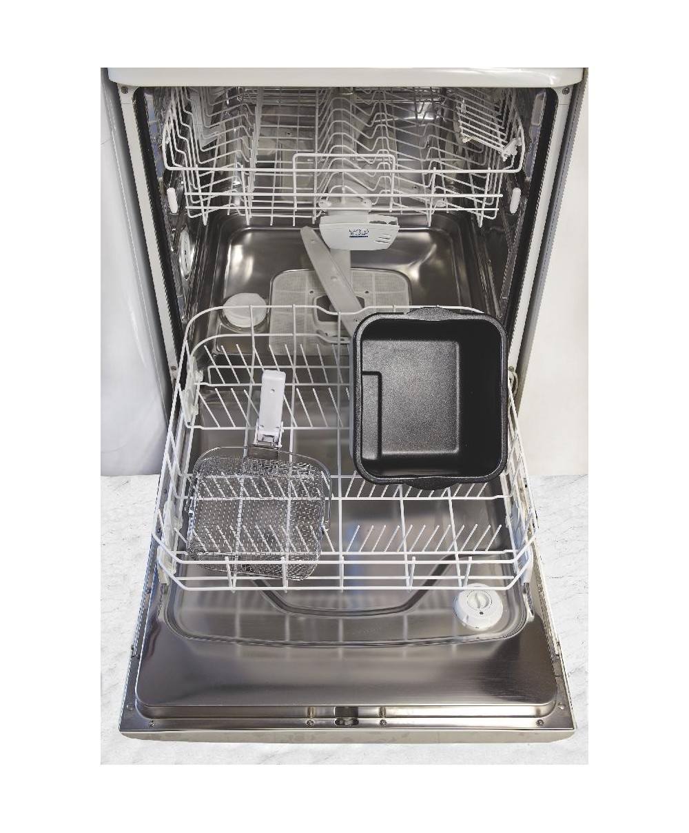 Easy Fry Metal è la friggitrice smontabile con cestello e vano olio lavabile in lavastoviglie con capacità da 2,5 a 2,9 lt di olio e 800gr di fritto. Grazie alla finestra per il controllo cottura, il manico con controllo esterno per il sollevamento e lo sgocciolamento dell’olio a fine cottura, ai pratici manici per il trasporto e al filtro permanente, Easy fry Metal frigge senza rilasciare cattivi odori, cuocere velocemente grandi quantità di fritto di ogni tipo, è semplicissima da pulire.