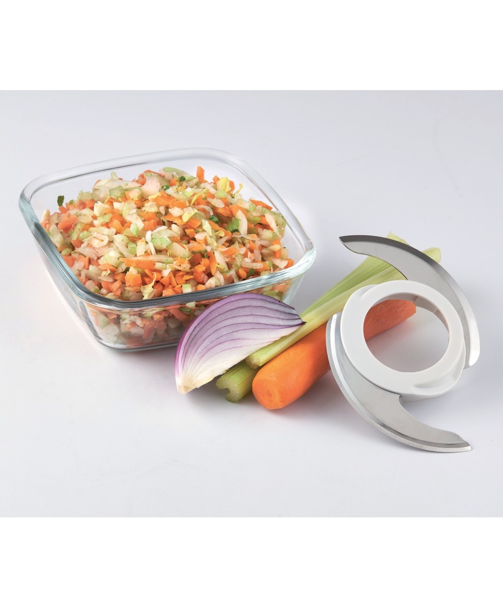 Robot da cucina completo di set di accessori e dotato di tazza blender in vetro, che usata con il set di lame in dotazione permette di tritare, sminuzzare, impastare qualsiasi ingrediente.