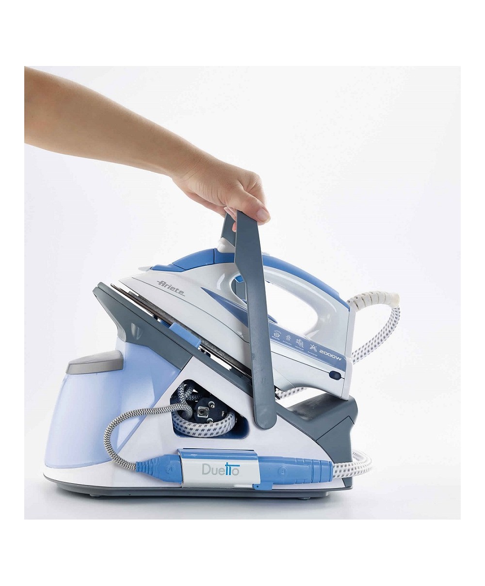Duetto è dotato di sistema sconnettibile Double Performance System, può essere utilizzato come efficace sistema stirante o come comodo ferro da stiro tradizionale.Le più alte Performance in tempi ridotti grazie ad un capiente serbatoio la 1,5 lt a ricarica continua. Piastra INOX superscorrevole su tutti i tessuti. Anti-calc System con cartuccia anticalcare estraibile. Unico, efficiente, veloce, funzionale e comodo! Da oggi basta un click per trasformare un sistema stirante in un ferro da stiro tradizionale!