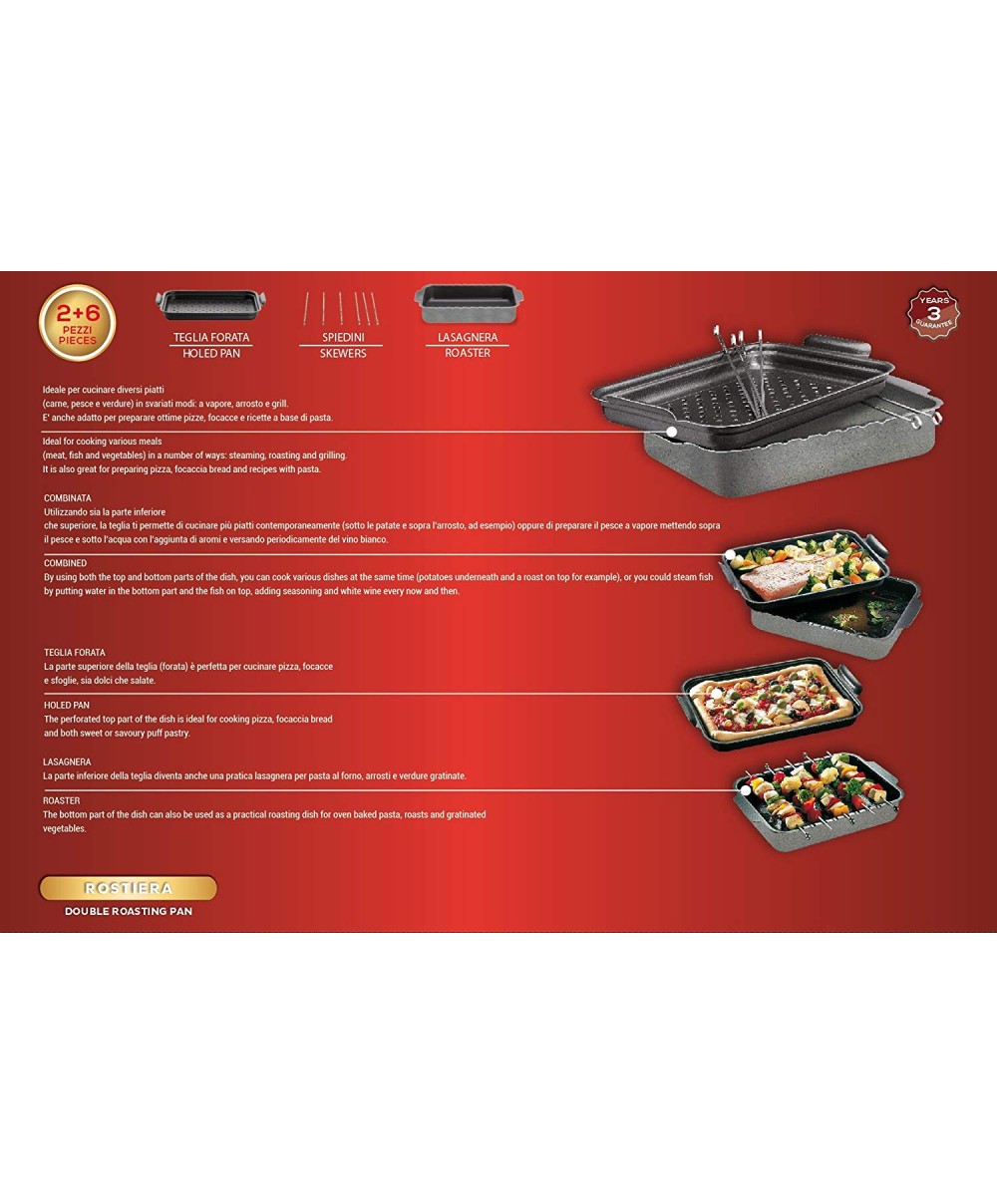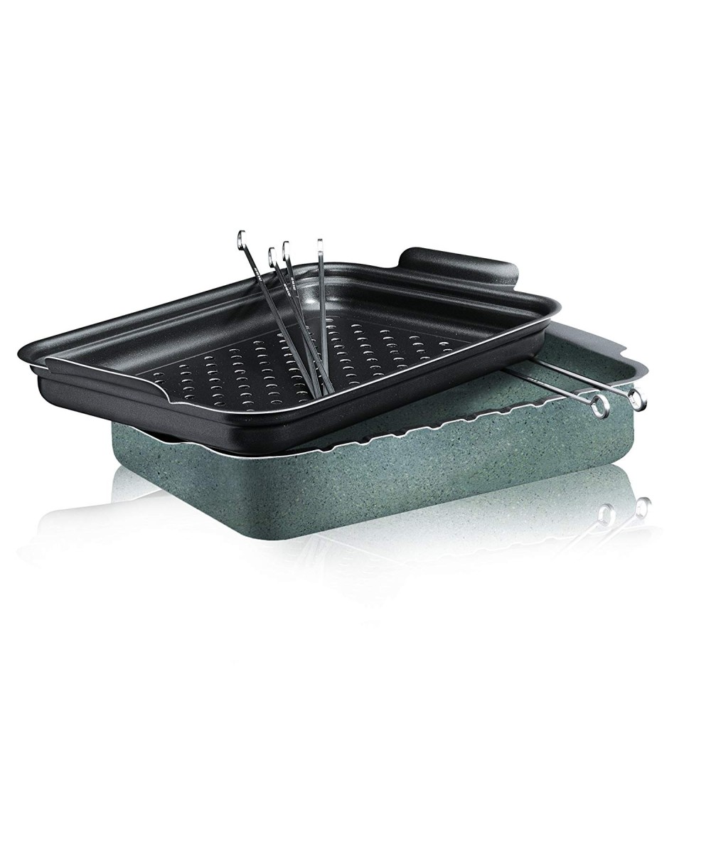 - Rostiera doppia formata da una lasagnera, una teglia forata e spiedini.