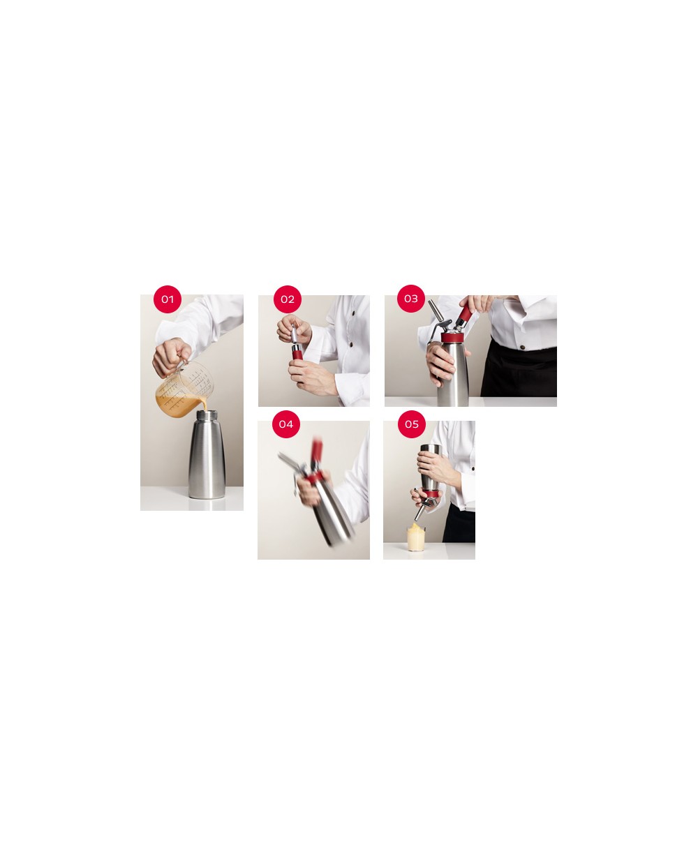 Sifone altamente professionale, con bottiglia in acciaio e testata con valvola fissa, lavabile in lavastoviglie. Si utilizza per panna montata, panna aromatizzata e anche per "Espumas e Mousse": fredde e calde, dolci e salate. I preparati freddi devono essere messi in frigorifero per minimo 4-6 ore prima dell'utilizzo, meglio se capovolti oppure sdraiati, i preparati caldi vanno tenuti a "Bagno Maria". In dotazione 1 beccuccio a lancia, 1 beccuccio a tulipano, 1 beccuccio espumas, 1 spazzolino pulizia.