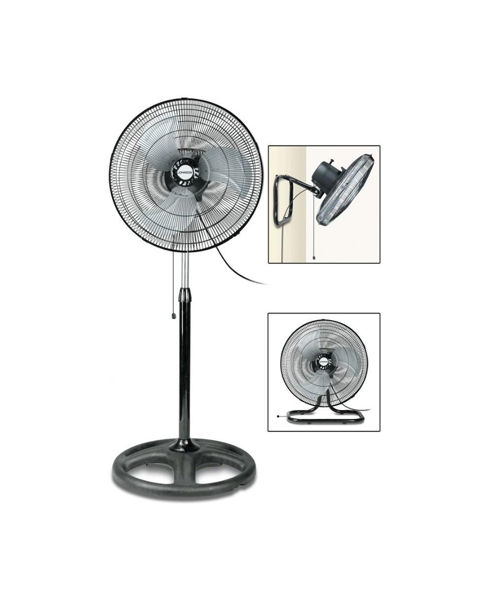 Il ventilatore può essere posizionato sulla piantana, sul tavolo o appeso alla parete. Il diametro di 50 cm, l'altezza regolabile da 100 a 130 cm, il potente motore da 55W, la struttura in metallo e la possibilità di utilizzarlo in più posizioni rendono 3 IN 1 di Johnson un ventilatore versatile che può essere utilizzato in qualunque ambiente.