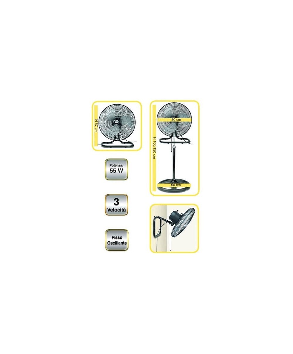 3 IN 1 è il ventilatore che si trasforma da ventilatore a piantana a ventilatore a parete, passando da ventilatore da tavola. Potenza: 55W