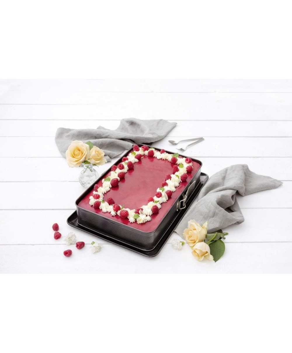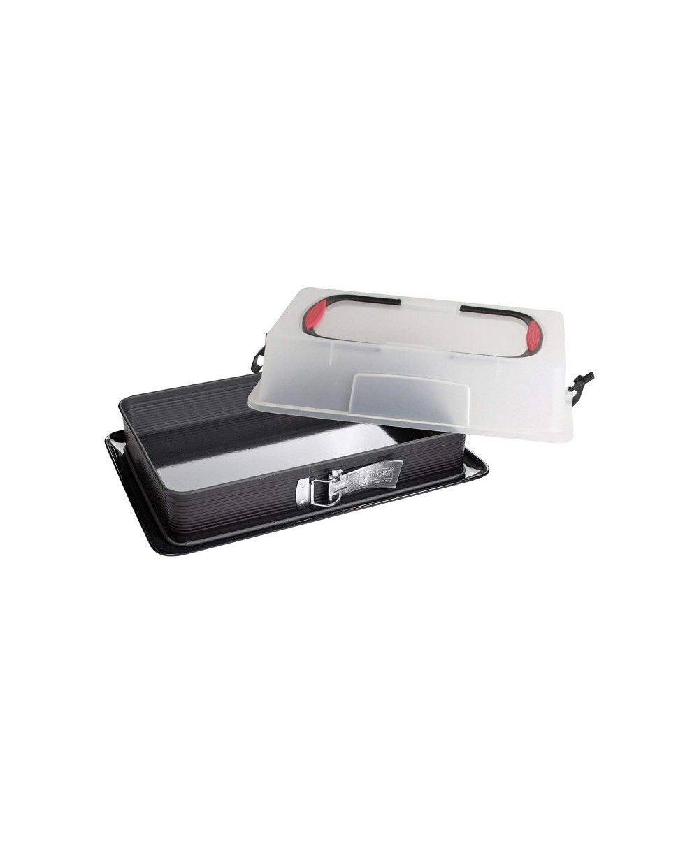 La tortiera rettangolare apribile con cerniera di Zenker si trasforma in un praticissimo porta torte: lo stampo ha in dotazione un coperchio in plastica che, applicato alla tortiera, permette di conservare igienicamente il dolce al suo interno o di trasportarlo comodamente.
