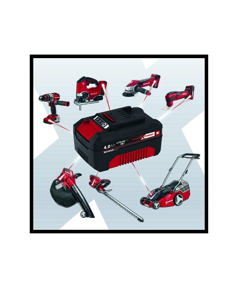 La tecnologia Power X-Change di Einhell permette di utilizzare una batteria (2 batterie da 18 V per gli apparecchi da 36 V) per tutti gli utensili e gli attrezzi Power X-Change per l'officina ed il giardino.