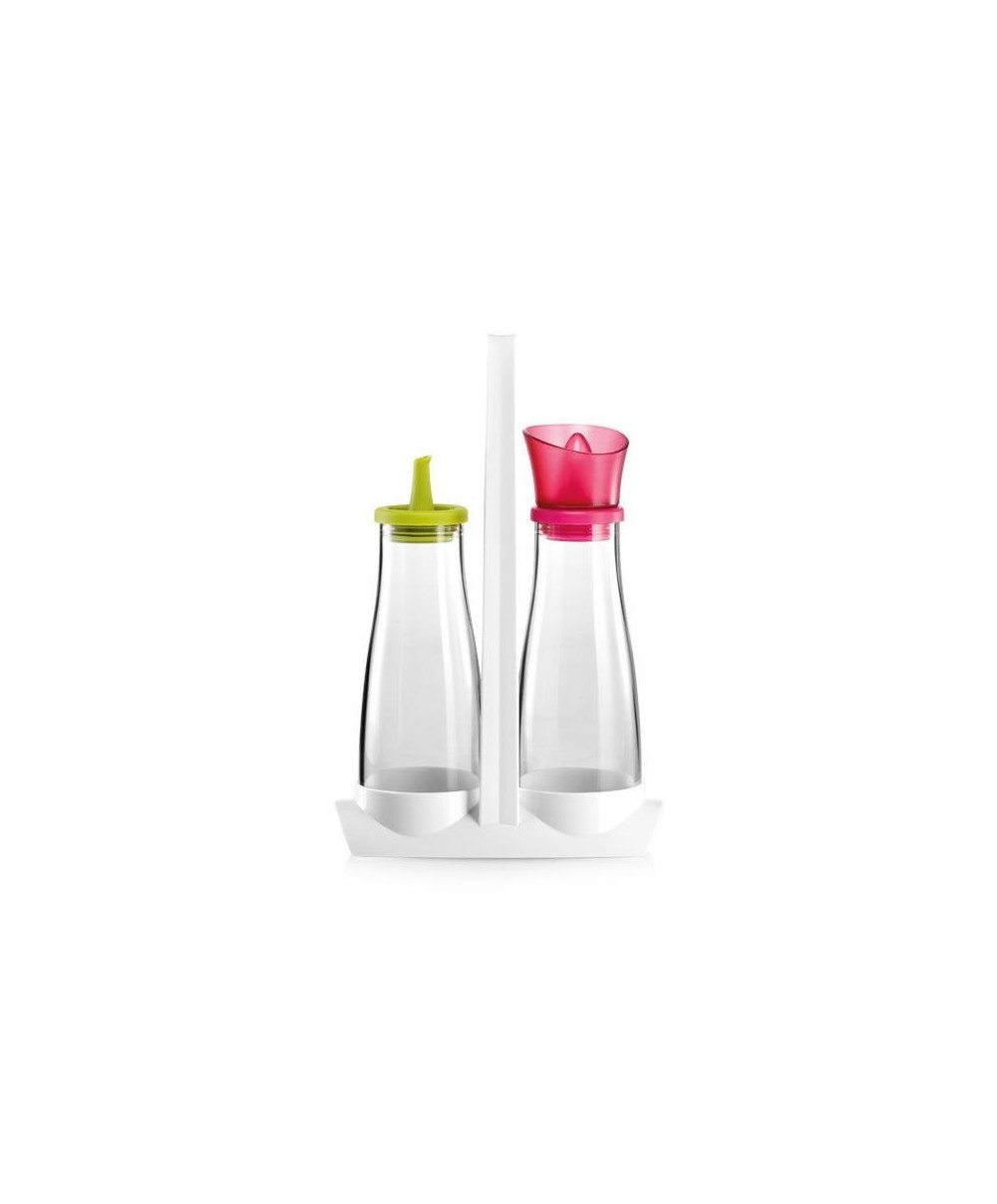 Il set per condire si compone di un'oliera e un'acetiera entrambe da 250 ml, e di uno stand per portare in tavola le due bottiglie. I beccucci in silicone flessibile ti permettono di versare l'olio e l'aceto a filo, senza sgocciolare; tappi e beccucci di oliera e acetiera hanno colori diversi, verde e bordeaux, per distinguere i condimenti.