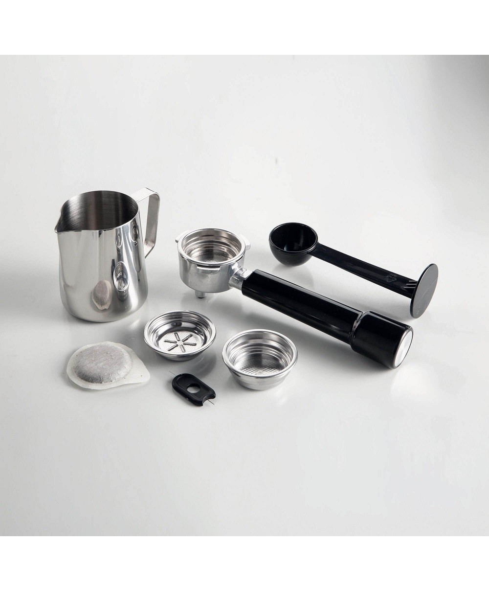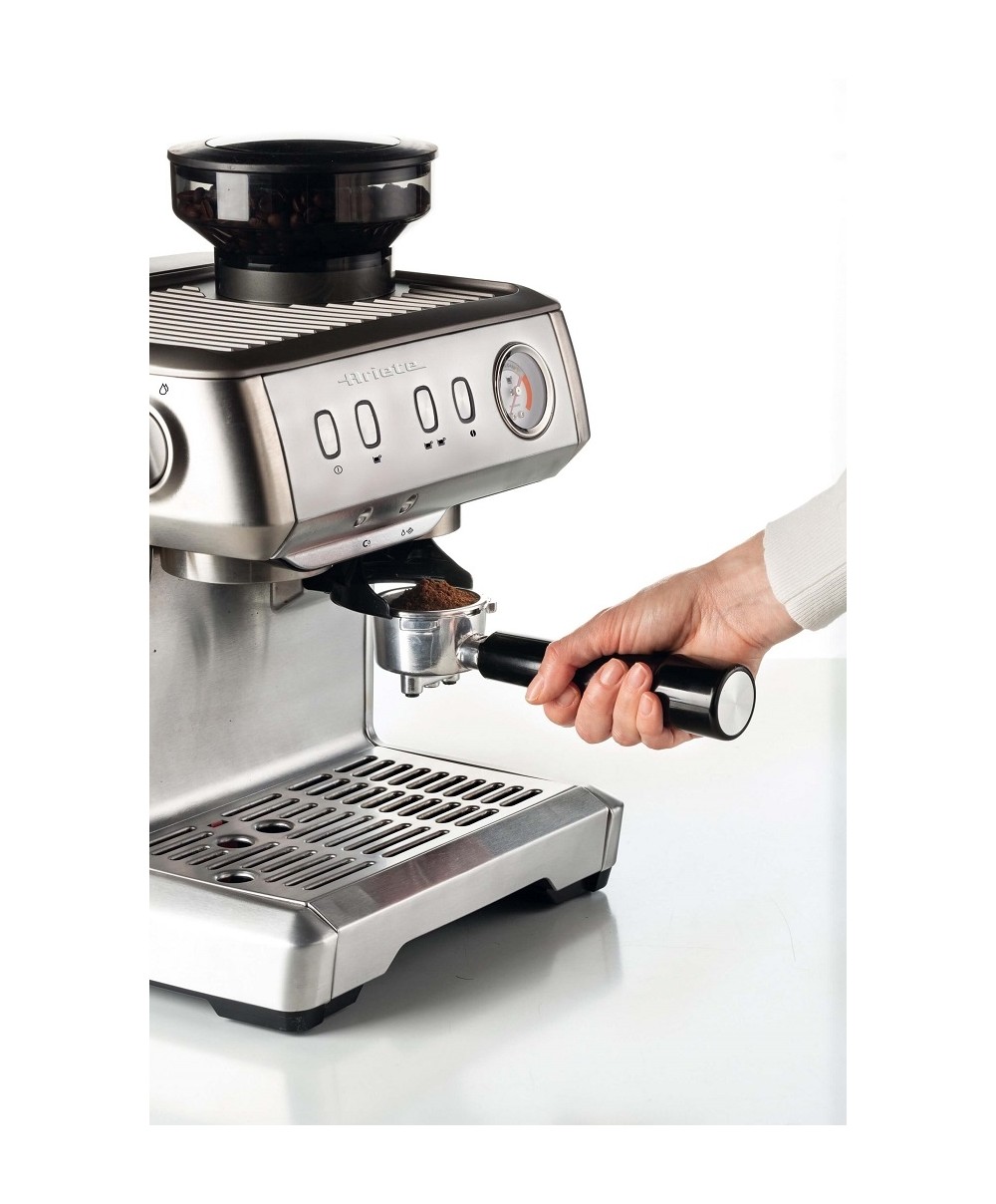1313 è la macchina per caffè espresso di Ariete realizzata in metallo ed ideale per essere utilizzata sia con caffe in polvere che con cialda ESE. È dotata di macinacaffè integrato.