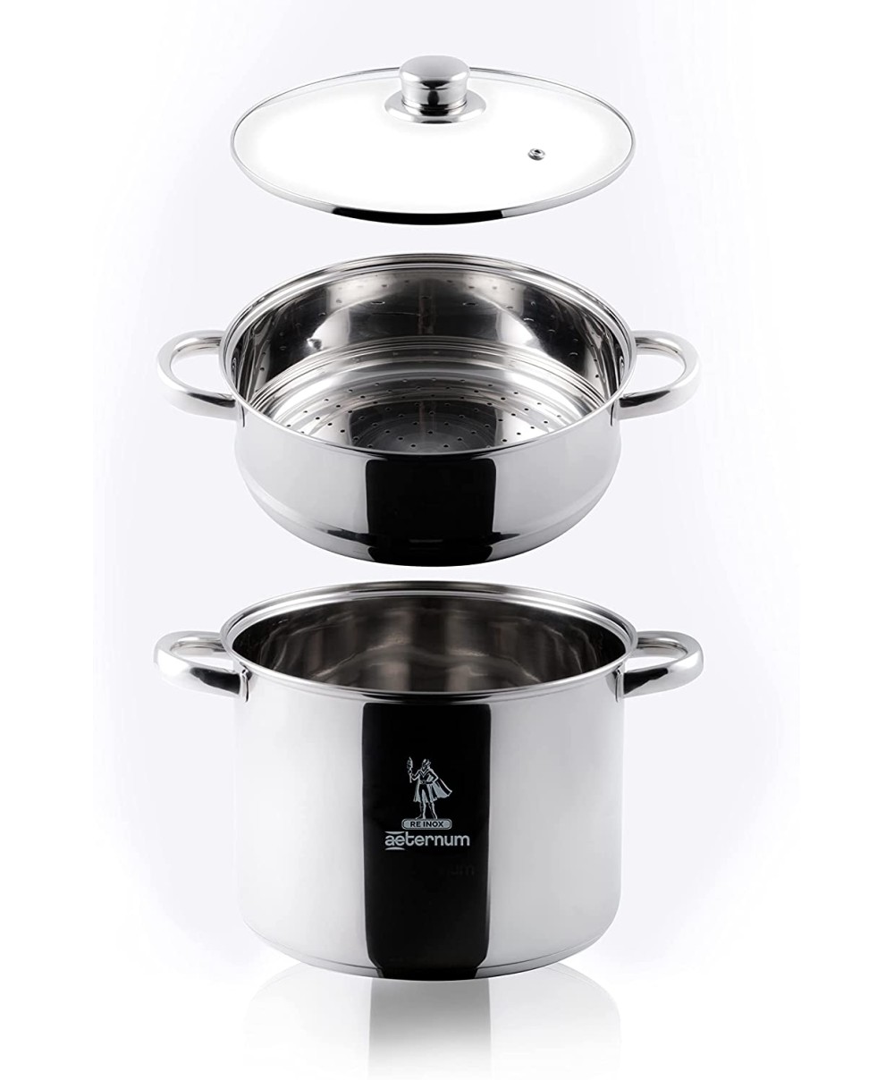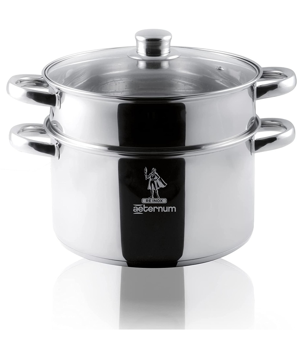 "Indispensabile in ogni cucina, la Vaporiera Divina Re Inox di Aeternum presenta una combinazione unica tra qualità e durata grazie al suo corpo in acciaio inox. Corpo in acciaio inox 10/10 ad elevato spessore, fondo in triplo stato acciaio-alluminio-acciaio, adatto anche su induzione, maniglie in acciaio Inox 18/10 e coperchio in vetro con pomolo in acciaio