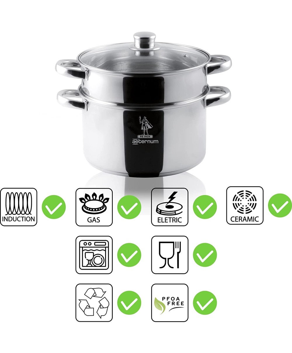 Vaporiera Divina Re Inox Ø 22cm di Aeternum si caratterizza per la casseruola ed il cestello in Acciaio INOX 18/10 ed il coperchio in vetro con pomolo in acciaio. Il fondo della casseruola in triplo stato acciaio-alluminio-acciaio, rende questa vaporiera adatta anche sui piani ad induzione.
