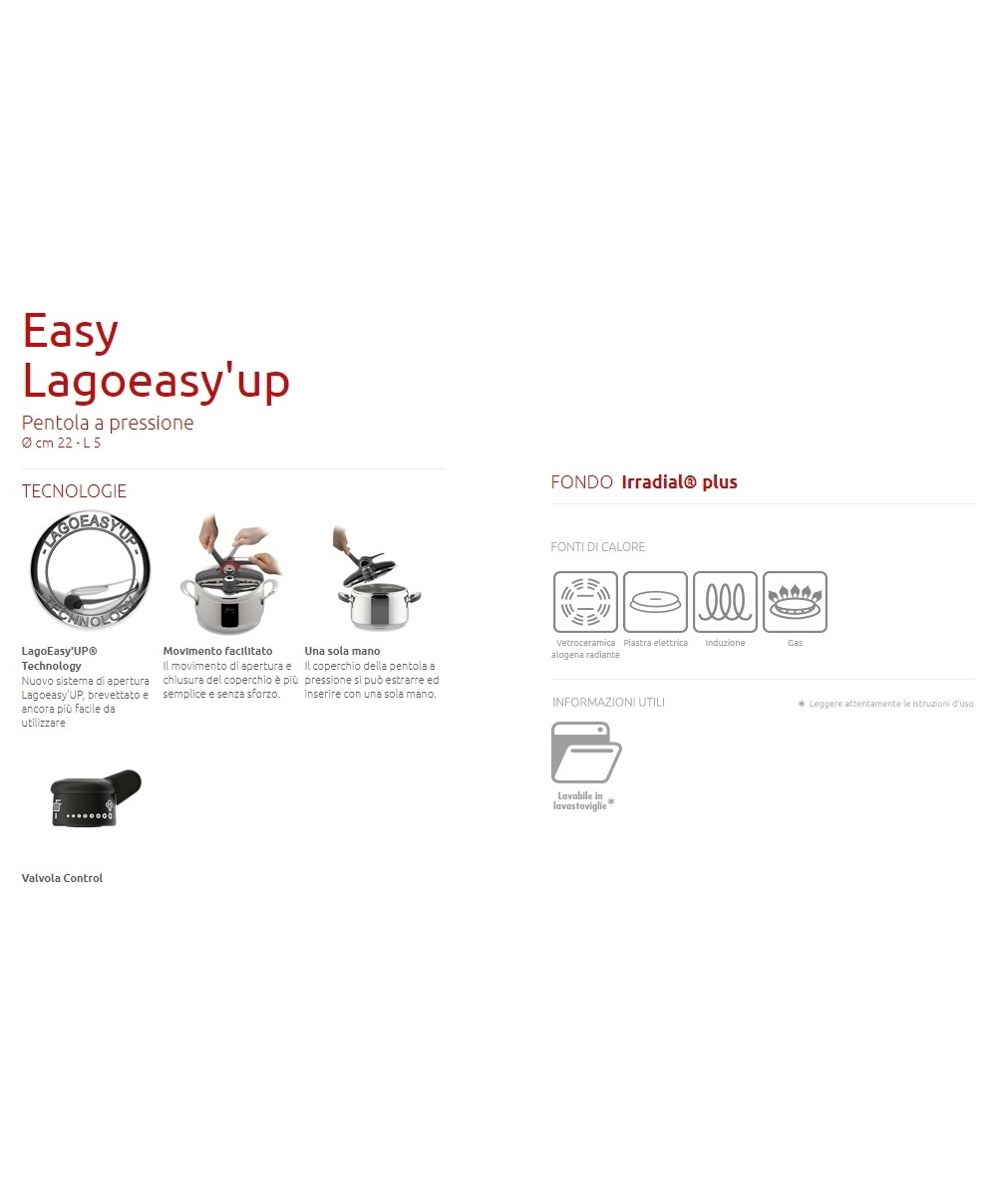 "La Pentola a pressione EASY LAGOEASY'UP rappresenta oggi un’innovazione senza precedenti grazie all’esclusiva LagoEasy’Up® Technology, il nuovo sistema di apertura brevettato, facile da aprire con una sola mano ed in un solo movimento. La pentola a pressione è uno strumento versatile perché consente la cottura a vapore, ad immersione e a rosolatura; è salutare, perché cucinando in pentola a pressione si preservano fino al 35% di vitamine e di sali minerali in più; è veloce, perchè riduce i tempi di cottura fino al 50%. E' inoltre dotata di ben 6 sistemi di sicurezza e della valvola Control: basta ruotarla accompagnando la levetta per controllare direttamente la fuoriuscita verticale del vapore Il fondo a 3 strati Irradial Plus® è adatto a tutti i piani di cottura, induzione inclusa, per una perfetta diffusione del calore.