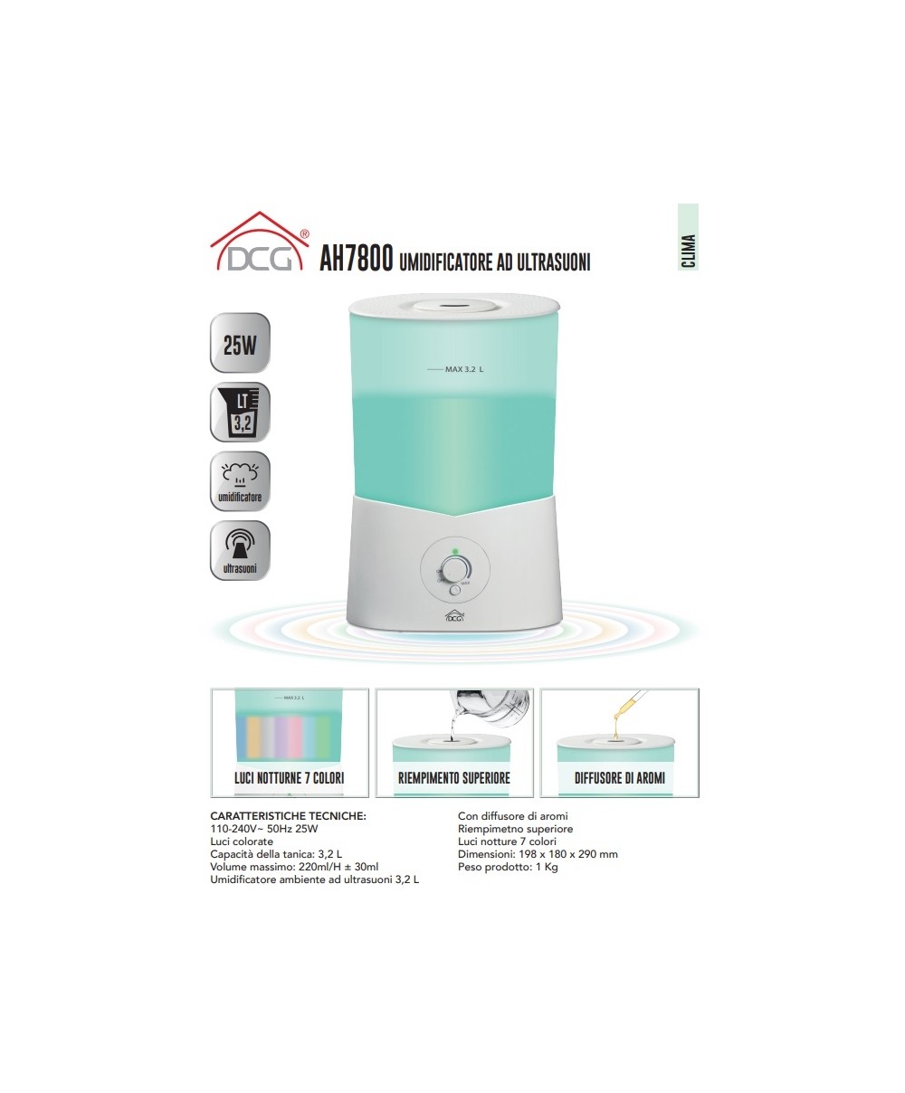 AH7800 è l'umidificatore ad ultrasuoni per ambienti firmato DCG.