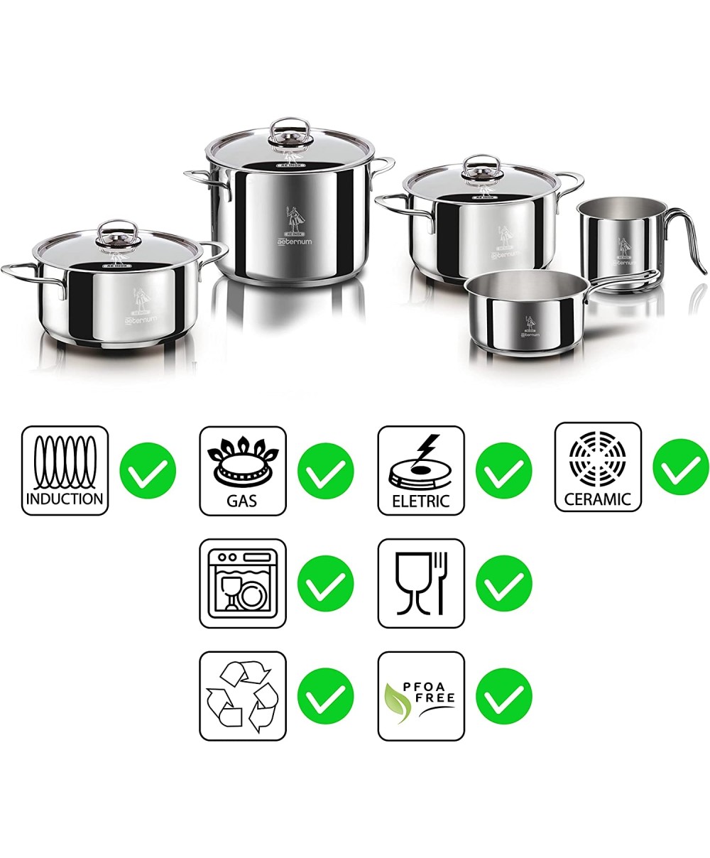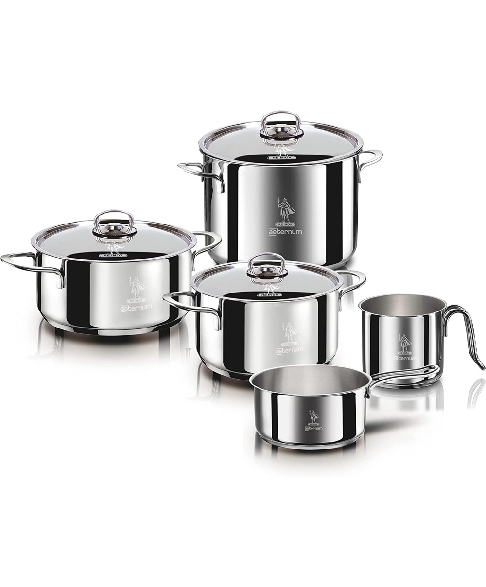 Divina Re 8 pezzi è la batteria di pentole di Aeternum realizzata in acciaio inox 18/10. Un intero set di strumenti da cottura con finiture e design accattivanti, per cucinare in modo sano e con stile e con un fondo ad alto spessore a tre strati (alluminio-acciaio-alluminio) adatto anche all’induzione.