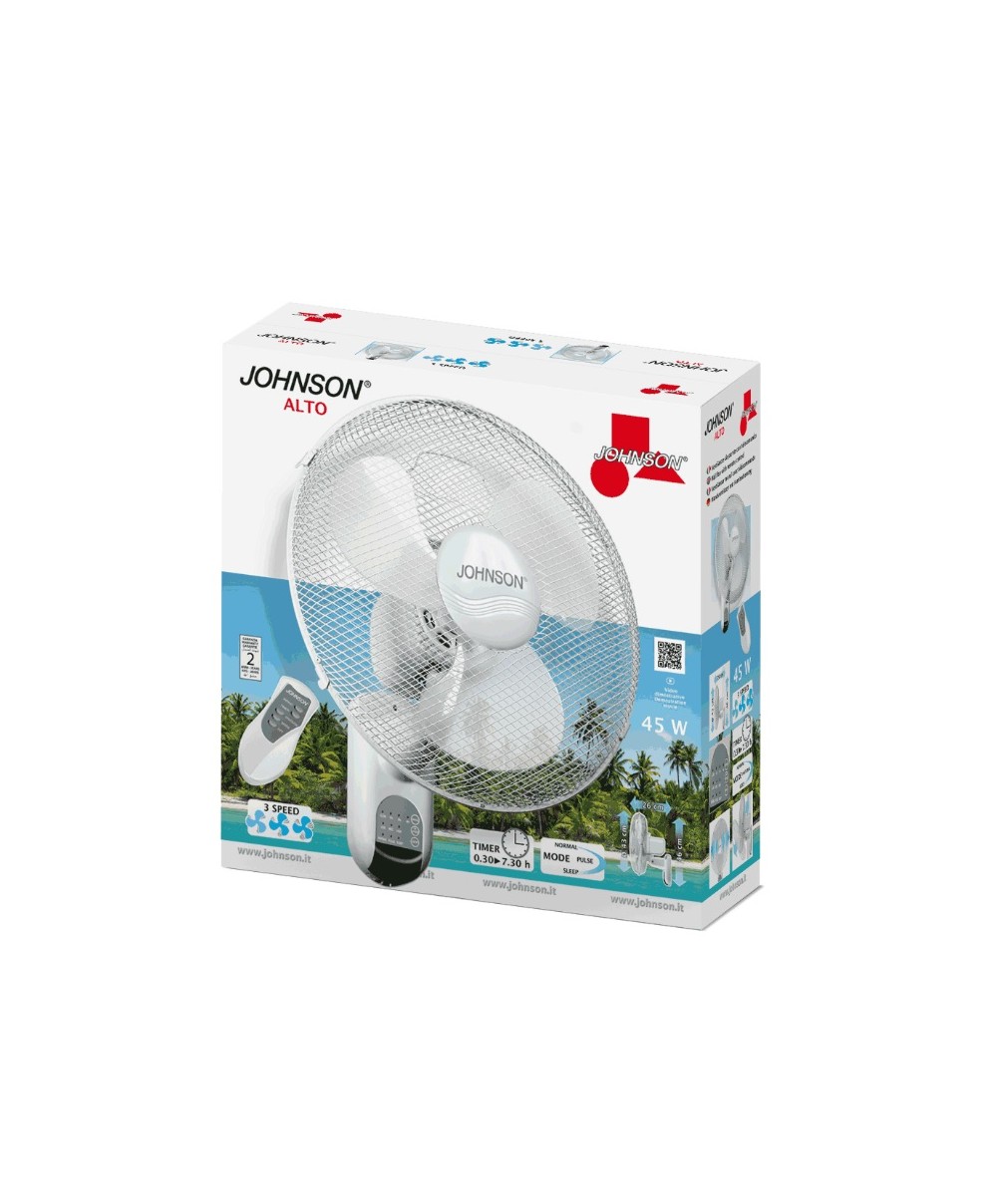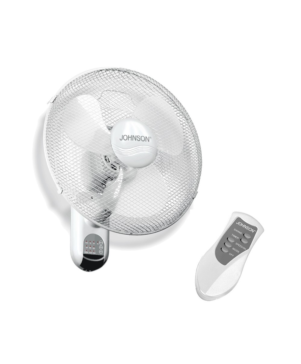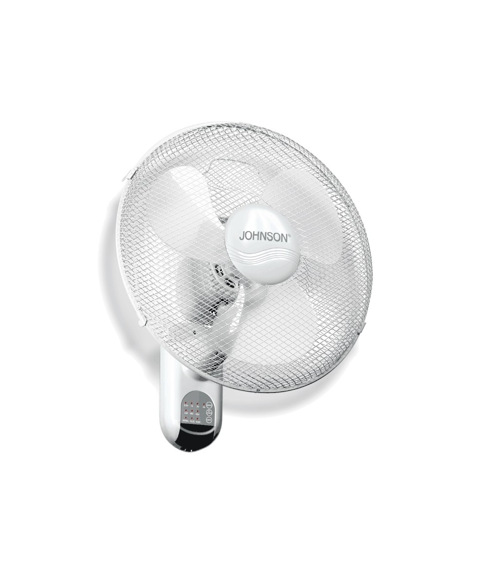 ALTO il ventilatore oscillante da parete con telecomando di Johnson con un diametro di 43 cm, oscillazione orizzontale, tre velocità e un motore da 45W. Può essere programmato per lo spegnimento automatico.
