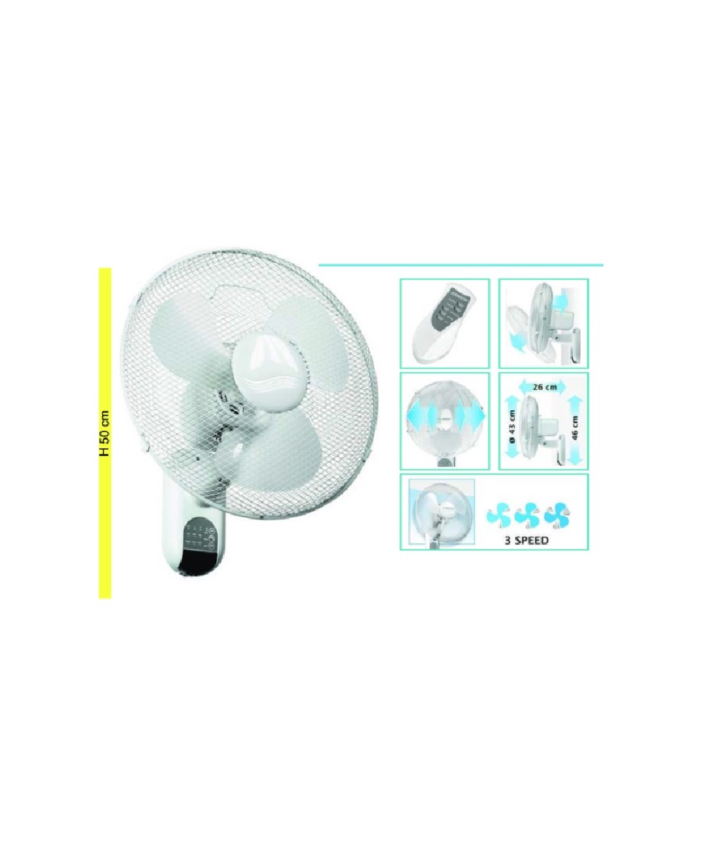 Il ventilatore oscillante da parete con telecomando è la soluzione ideale per combattere il gran caldo e l’afa. Con un diametro di 43 cm, oscillazione orizzontale, tre velocità, un’altezza di 50 cm ca e un motore da 45W, risulta compatto e versatile, può essere facilmente montato ovunque e utilizzato in qualunque ambiente.