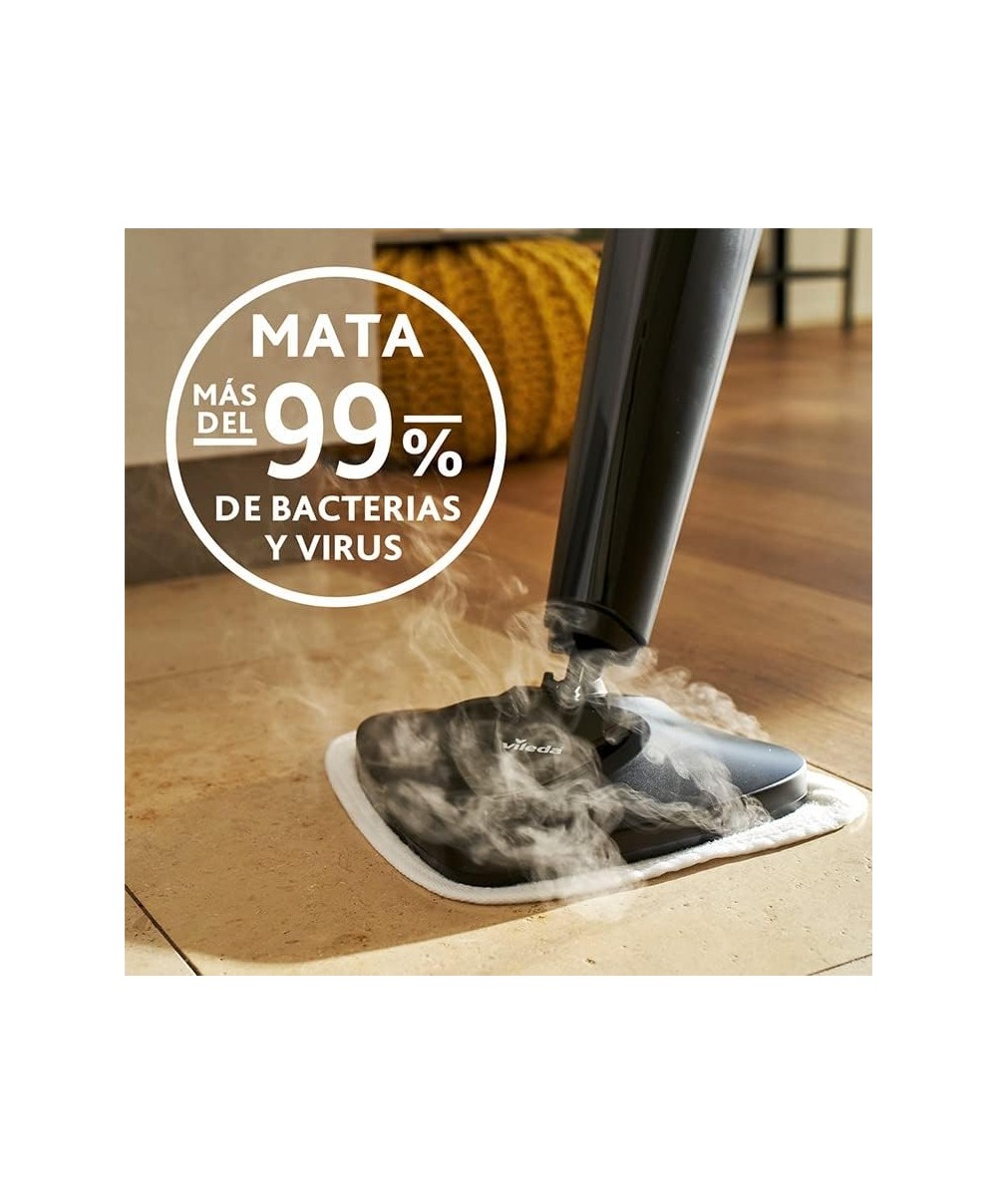 Vileda Steam PLUS garantisce la massima igiene, senza bisogno di usare detergenti. La potenza del vapore e le eccellenti prestazioni del panno in microfibra eliminano fino al 99.9% di batteri e virus* da tutti i tipi di pavimento.