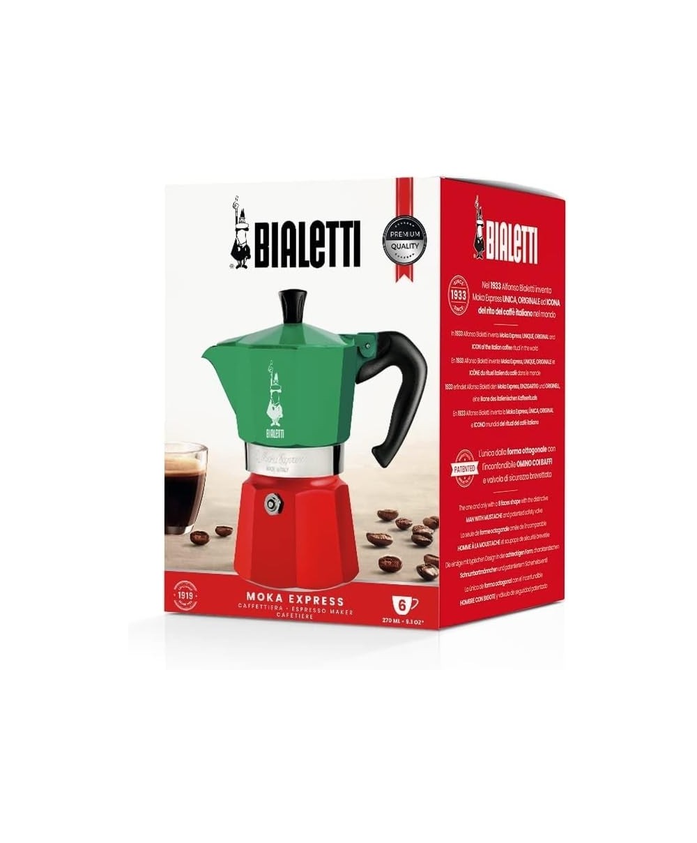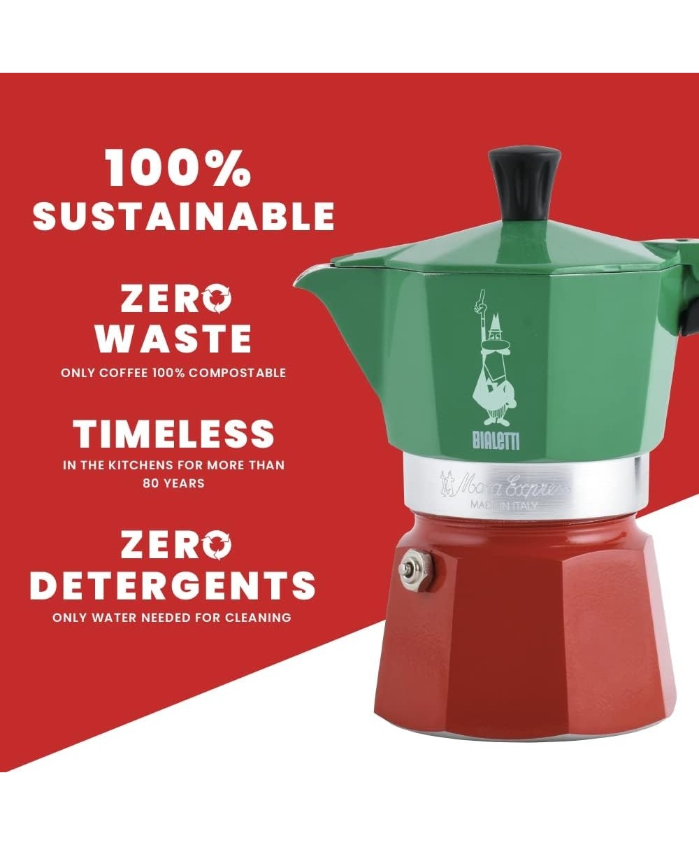 La versione Tricolore della Moka Express vuole celebrare anche nei suoi colori, il tradizionale rito italiano di preparare un buon caffè.