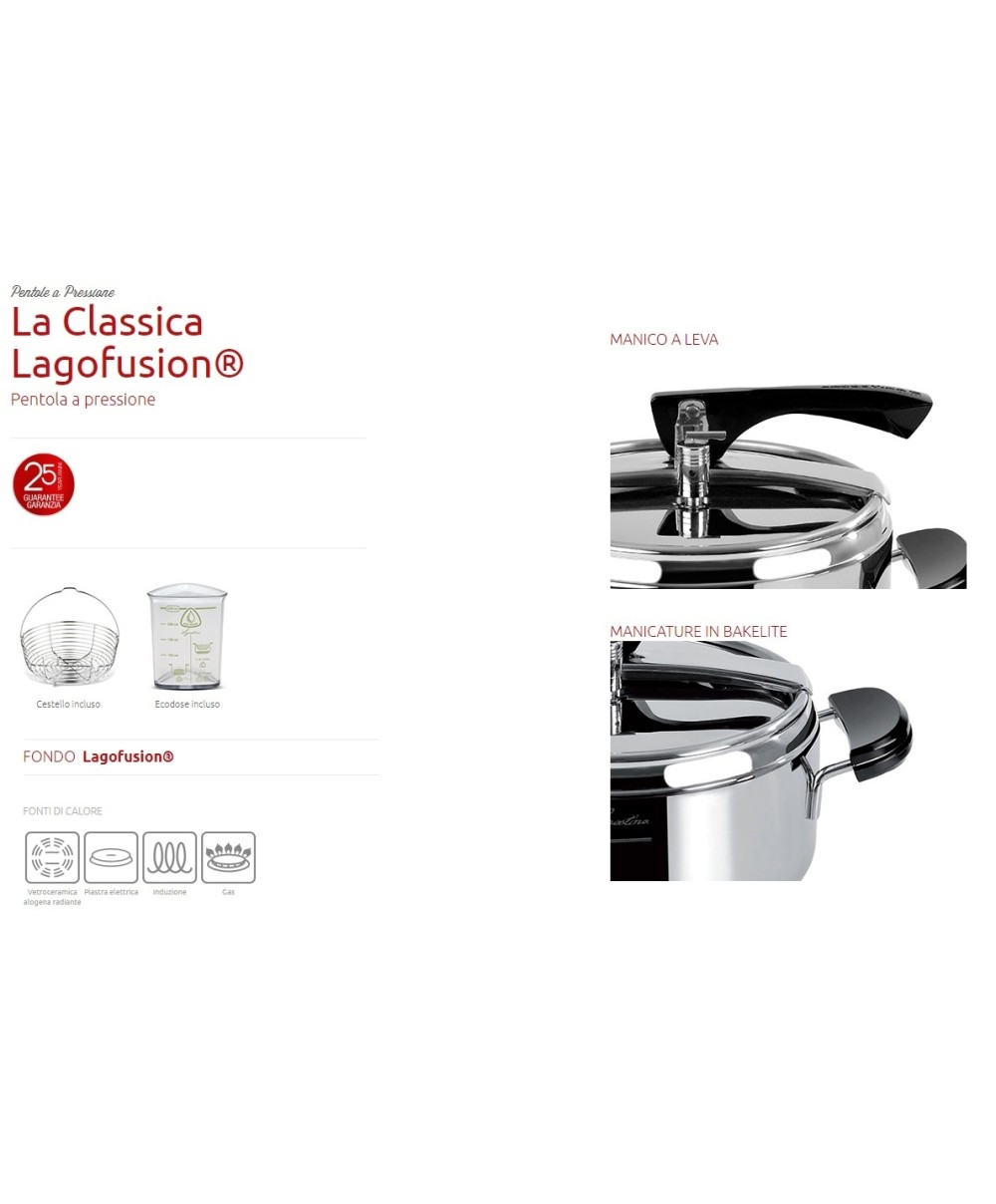 Dagli anni ’60 Lagostina è sinonimo di pentola a pressione per gli Italiani che amano i valori della famiglia, della condivisione e dello stare insieme. La Classica ritorna nelle nostre cucine con il design originale della pentola a pressione, unito alle più moderne tecnologie per l'acciaio inox e per la sicurezza. In più con cestello ed ecodose, La Classica porta sulla tavola delle nuove generazioni di italiani un sapore di genuinità, che legherà il saper fare di una volta alla voglia di sperimentare con passione, divertimento e facilità d'uso.
