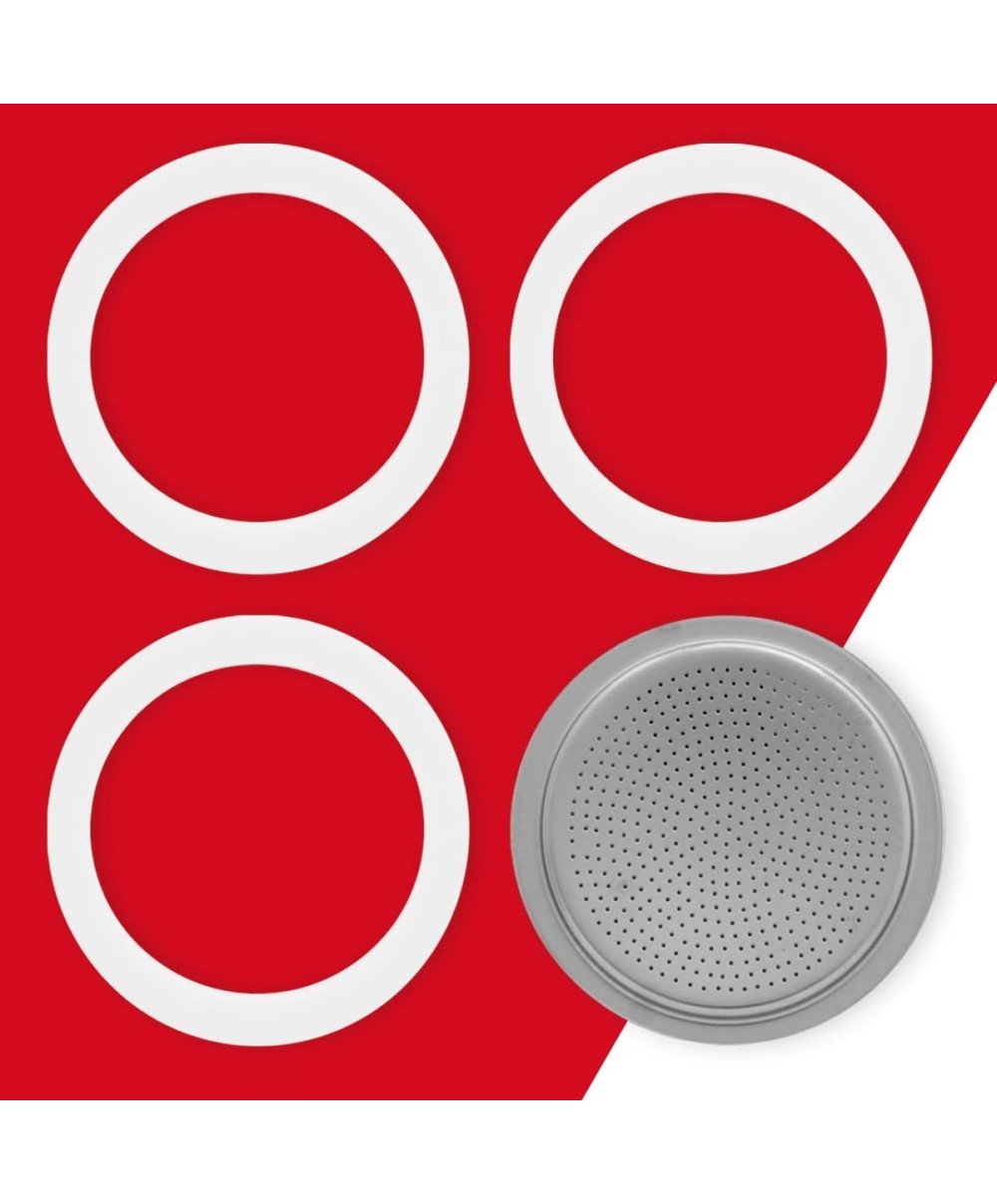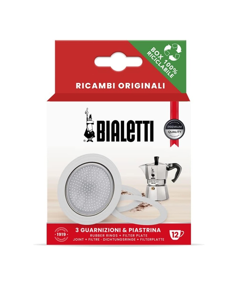 Il kit originale Bialetti della caffettiera da 12 tazze è composto da 3 guarnizioni e da una piastrina filtro.