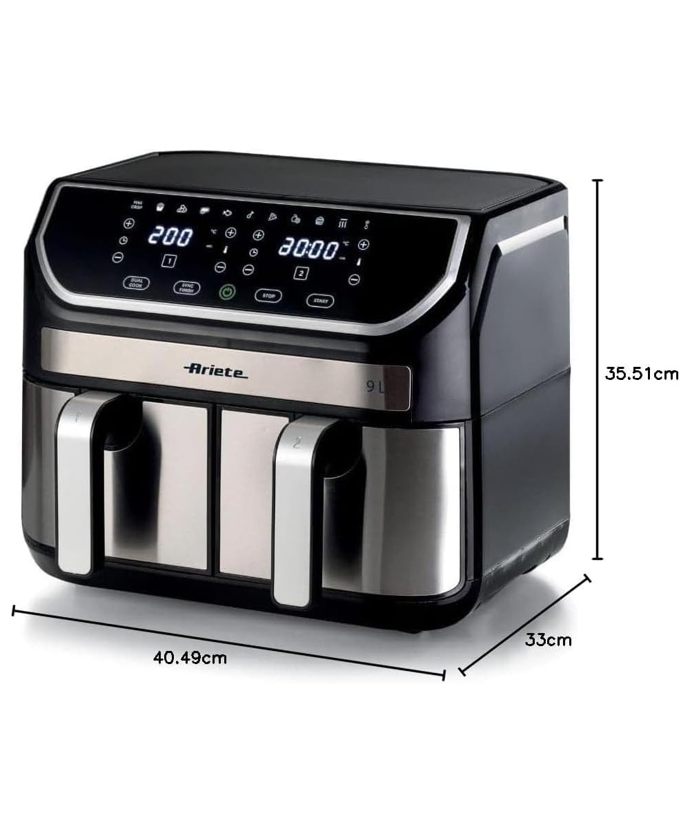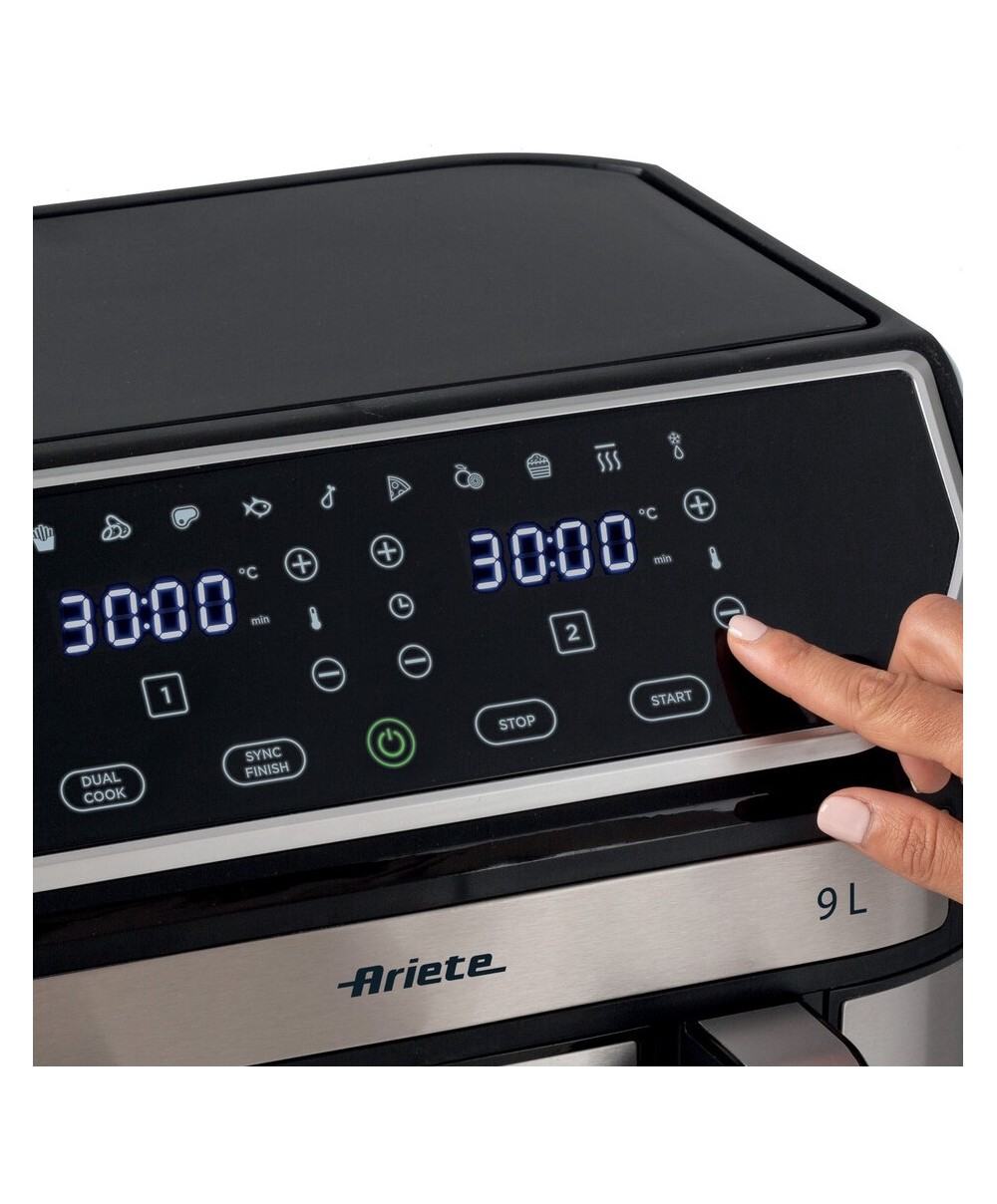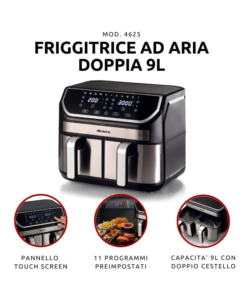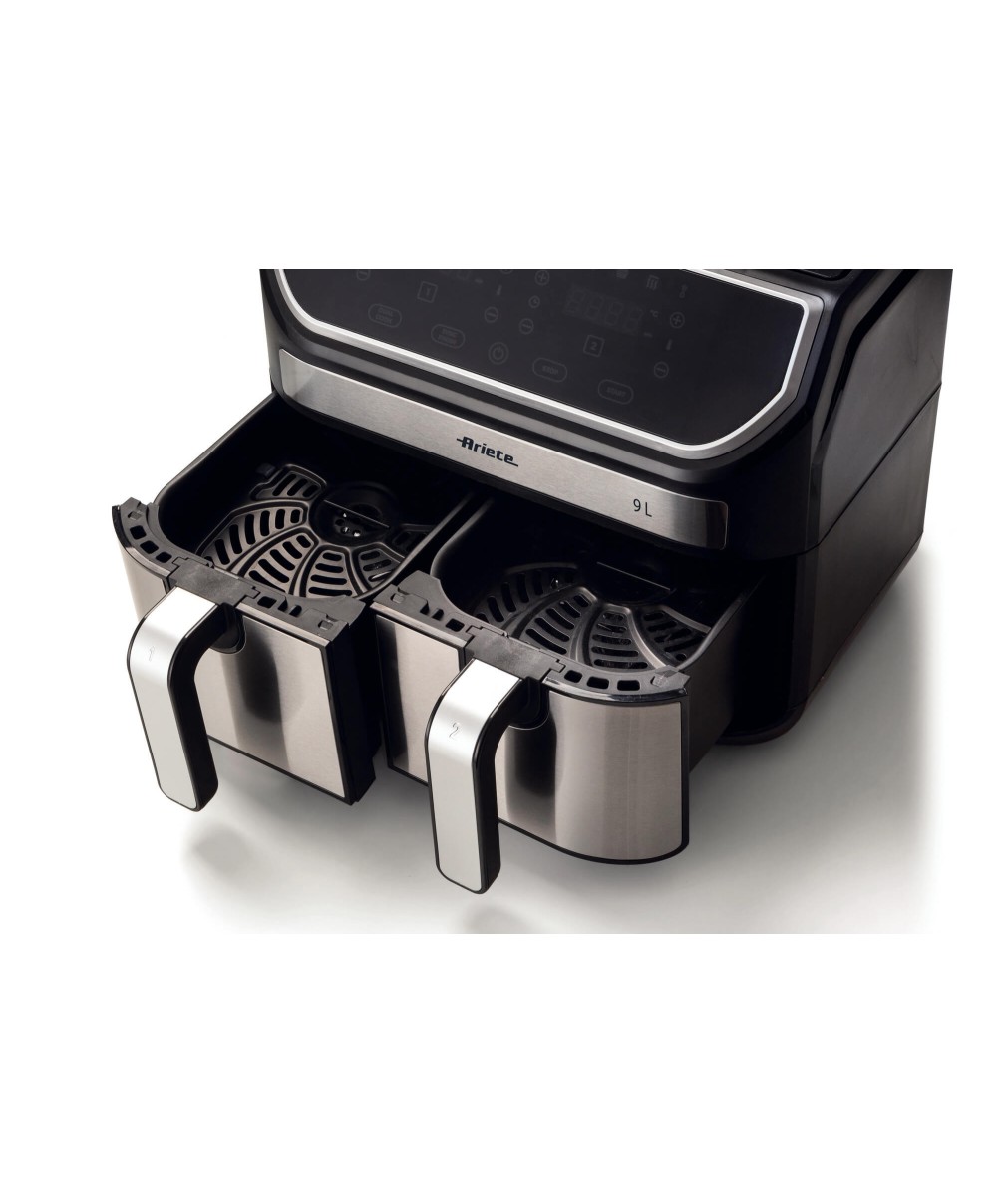 "Con la Friggitrice ad aria 9L puoi friggere qualsiasi pietanza in doppia quantità, utilizzando un solo cucchiaio di olio per ottenere fritture sane e gustose allo stesso tempo. Grazie ai 2 cestelli separati, 4,5 L per uno, con Friggitrice ad aria 9L di Ariete potrai cuocere fino a 3,6 kg di patatine fritte in una sola volta! Patatine fritte, ma non solo, anche crocchette, pesce, carne e tanti altri alimenti impanati, sia surgelati e pronti da friggere, che freschi e appena impanati, grazie a 8 programmi preimpostati.
