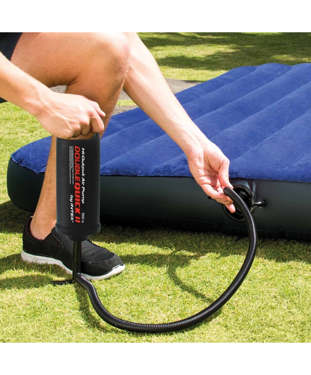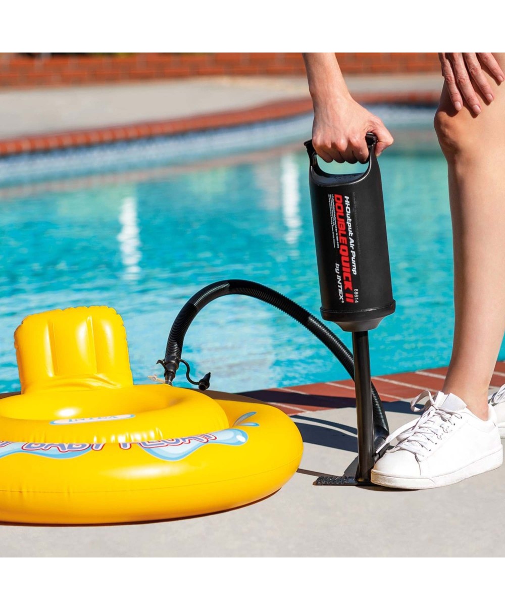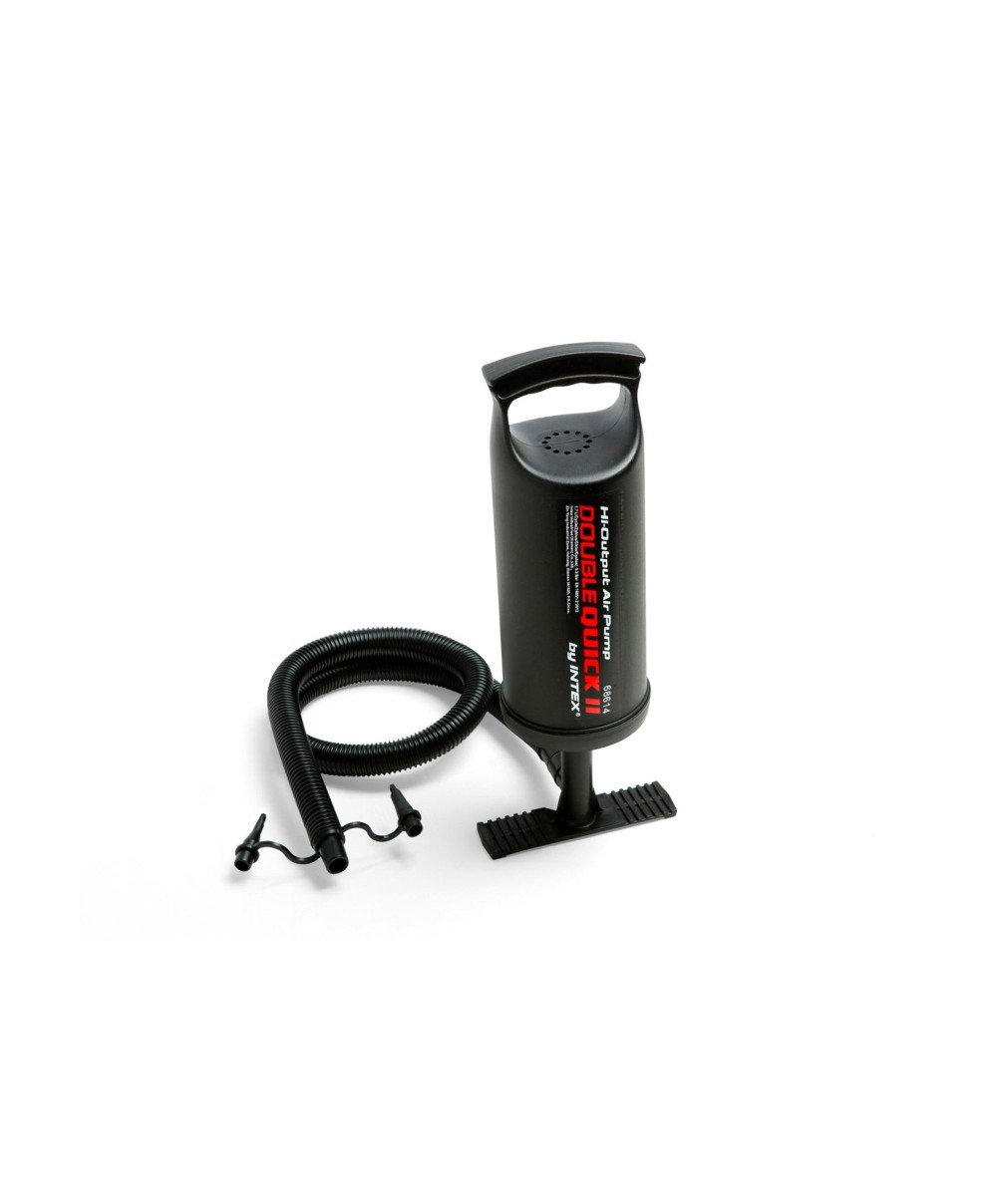 "Pratica, compatta e dotata di maniglia, la pompa manuale Double Quick II è alta 36 cm: posizionala a terra per gonfiare i tuoi gonfiabili preferiti, sia spingendo che tirando. I tre ugelli si adattano alle valvole dei differenti prodotti gonfiabili.