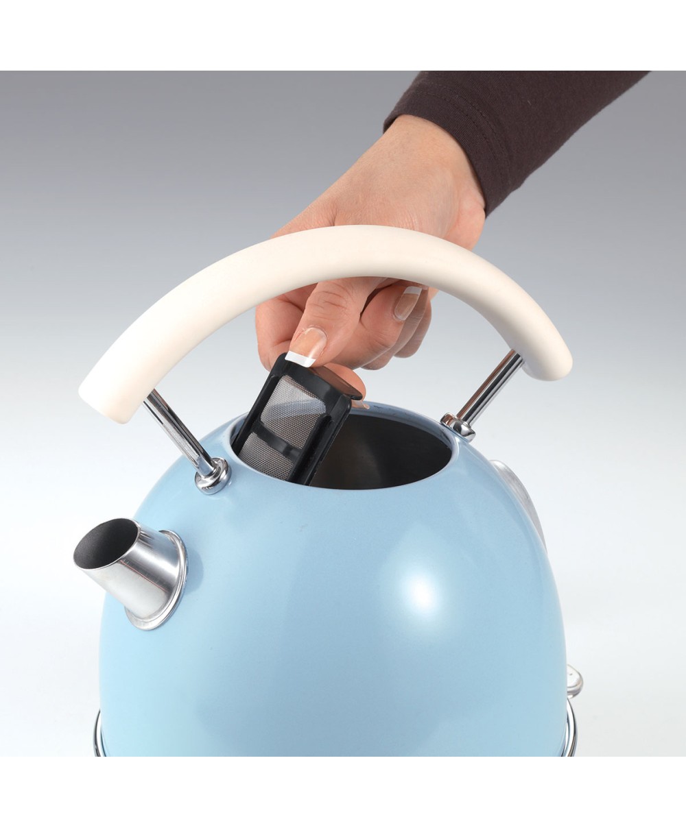 Bollitore dal design retrò che richiama le forme di una volta, indispensabile per assaporare al meglio il momento della colazione o della pausa pomeridiana. Dotato di filtro anticalcare removibile e facilmente lavabile, di impugnatura ergonomica con finitura soft touch e di un sistema di autospegnimento, rappresenta un alleato irrinunciabile in ogni cucina.