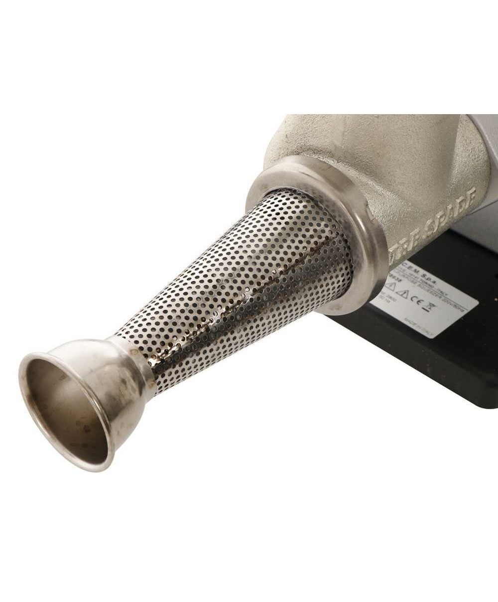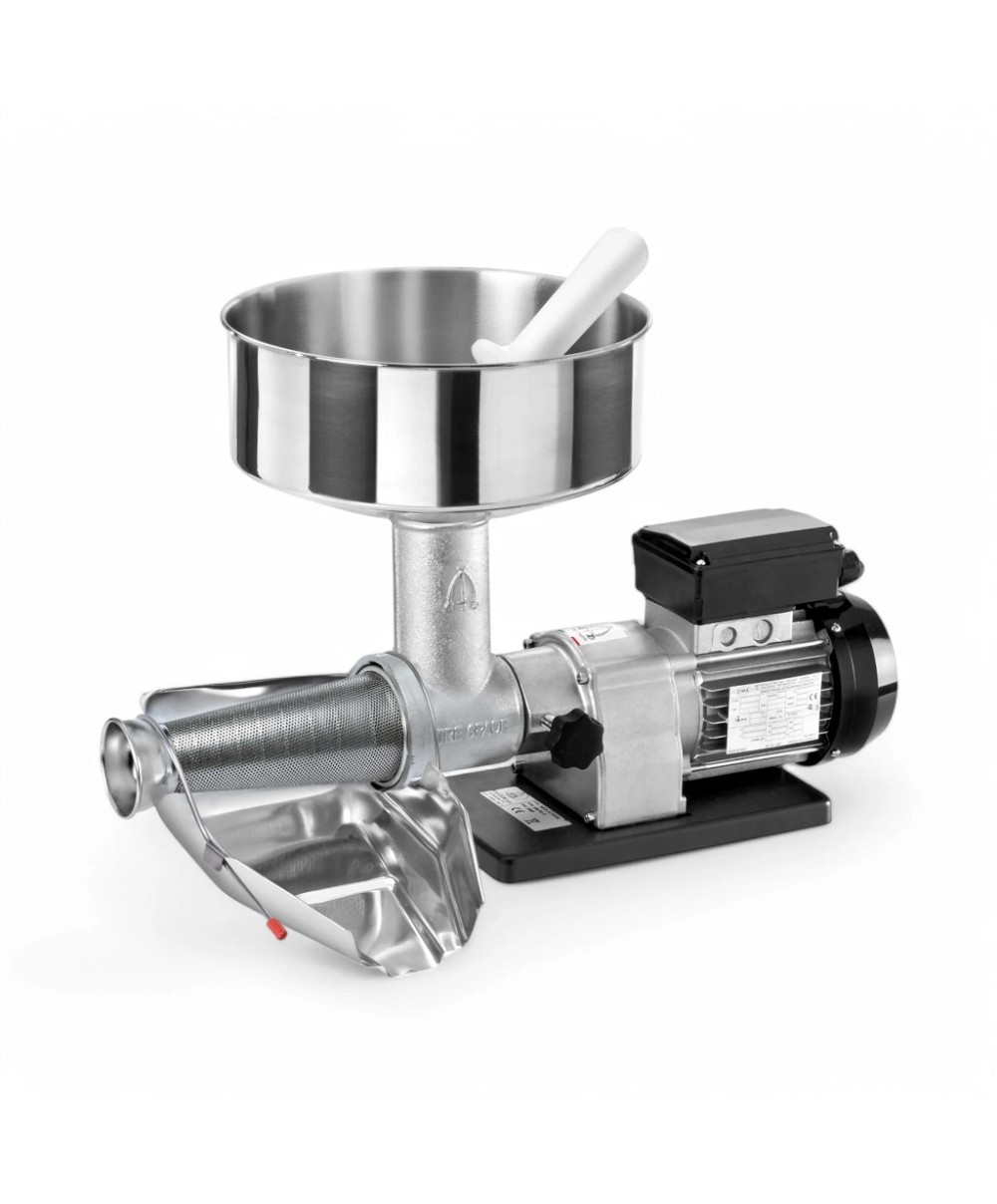 La macchina è robusta e affidabile, con corpo in ghisa stagnata, tramoggia e collettore in acciaio inox. L’elica in nylon certificato alimentare e il filtro inox da 1,5 mm garantiscono una passata liscia e priva di semi. I 160 giri/min dell’elica assicurano efficienza e velocità senza compromettere la qualità del prodotto finale.