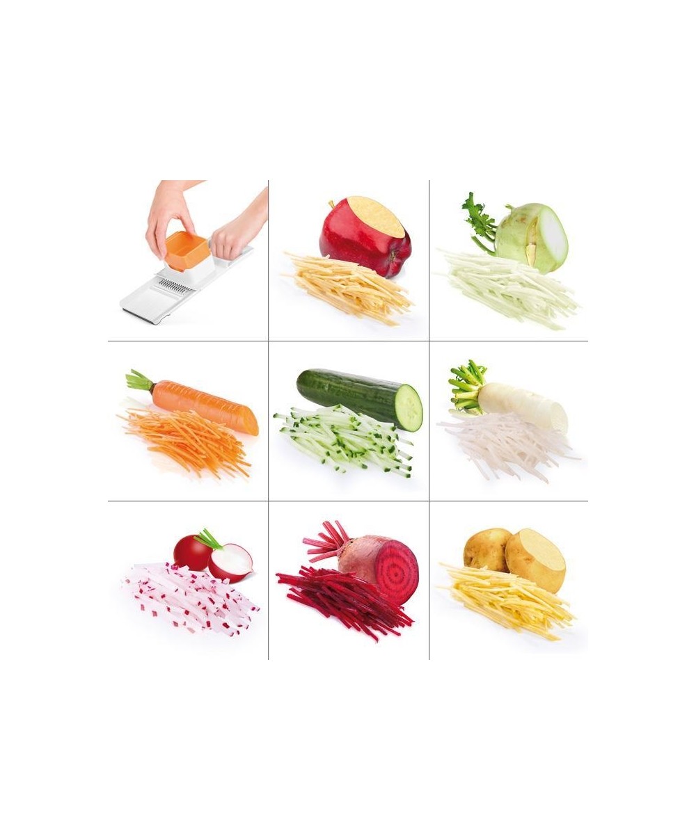 Questa mandolina ti consente di tagliare a julienne ogni tipo di frutta e verdura. È dotata di lame in acciaio inox, fissate verticalmente al centro; per affettare si fa scivolare ripetutamente l’alimento da tagliare, fissato ad un carrello di protezione, sulle lame.