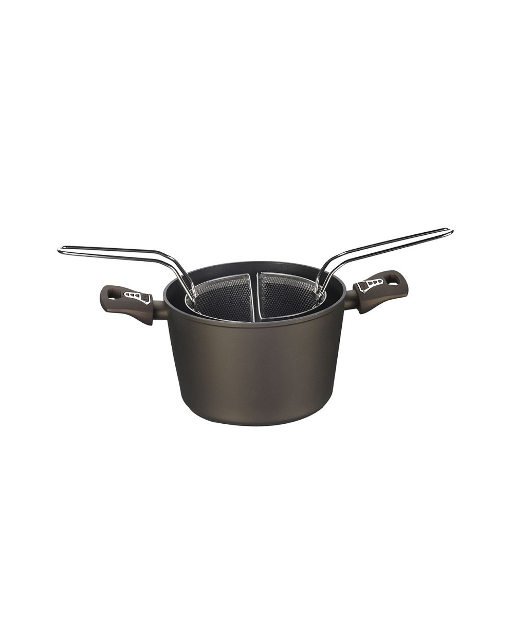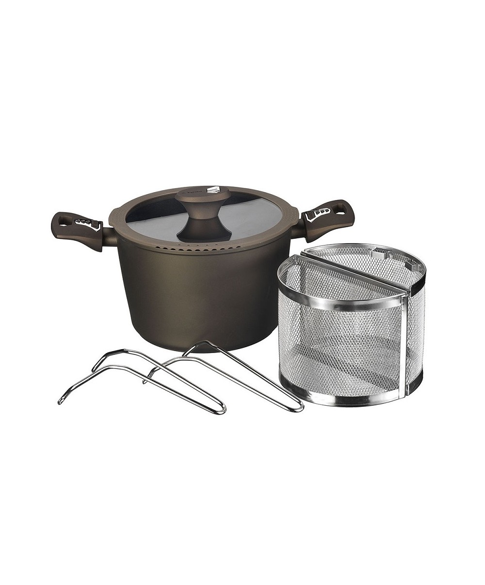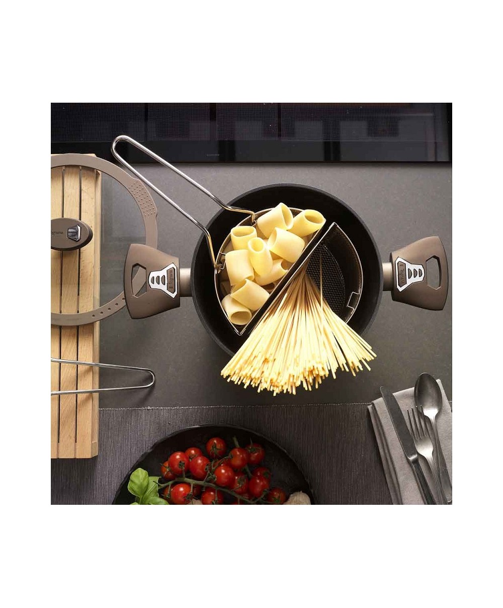 La pastaiola multifunzione della linea Diamantea è pratica ed è realizzata in alluminio forgiato ad alto spessore con l'esclusivo rivestimento antiaderente con polvere di diamante.